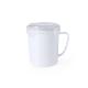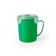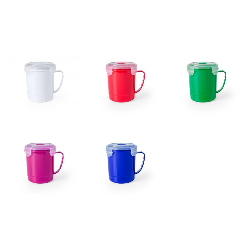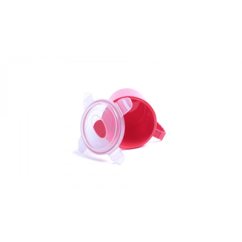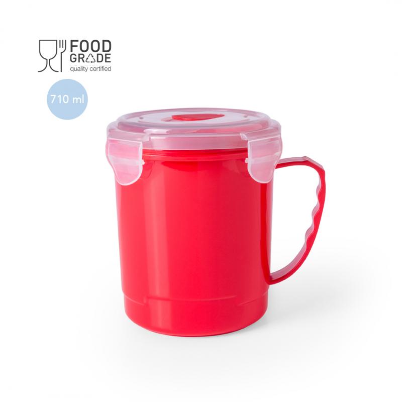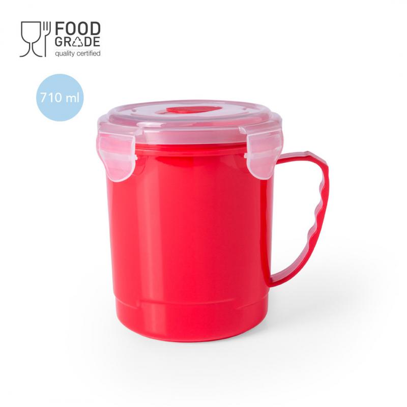 Tarro de 710ml de capacidad en resistente PP especialmente diseñado para líquidos. En variada gama en vivos colores, tapadera translúcida con 4 cierres, anilla de seguridad interior y dosificador integrado. Asa ergonómica a juego