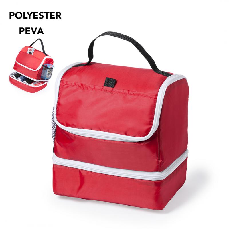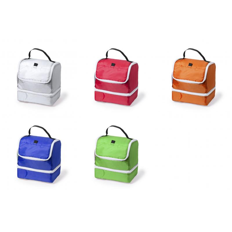 Nevera todoterreno en poliéster 210D de vivos colores y con dos compartimentos independientes con cierre de cremallera. Con bolsillo frontal de cierre de velcro y bolsillo de redecilla elástica en lateral. Interior isotermo en acabado PEVA. Con práctica asa de transporte en resistente nylon.