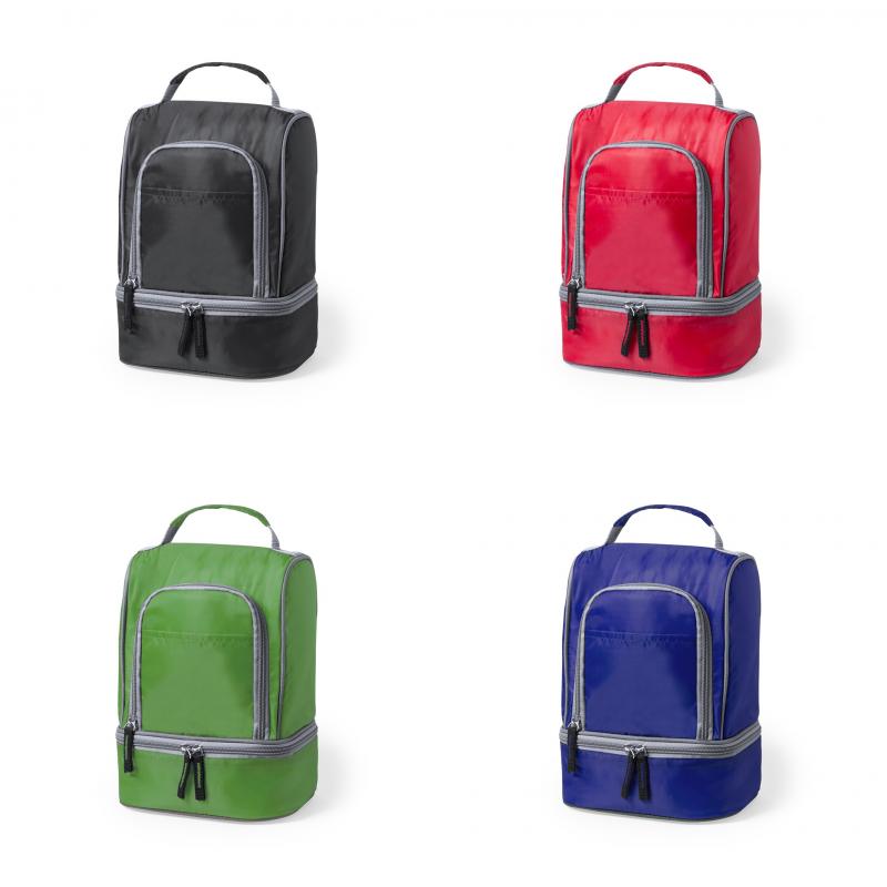 Nevera todoterreno en poliéster 210D de vivos colores y con dos compartimentos independientes con cierre de cremallera. Con bolsillo frontales, uno de ellos con cremallera, e interior isotermo en acabado PEVA. Práctica asa de transporte reforzada a juego.