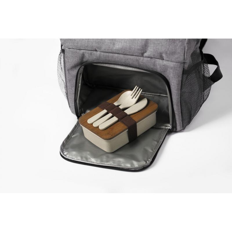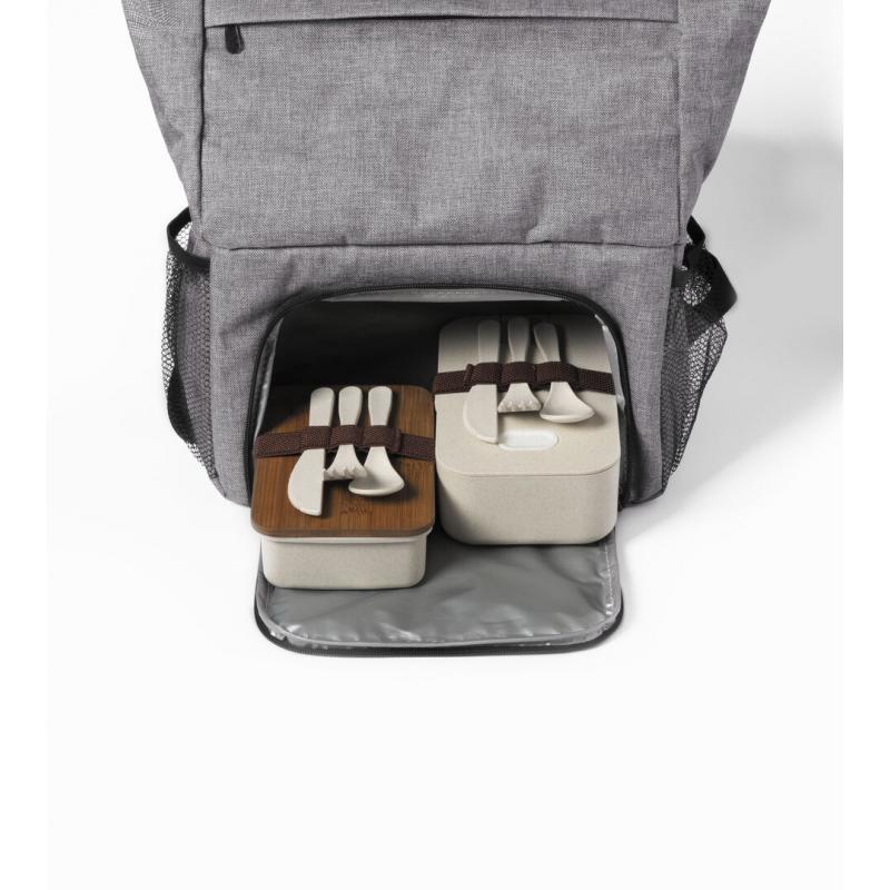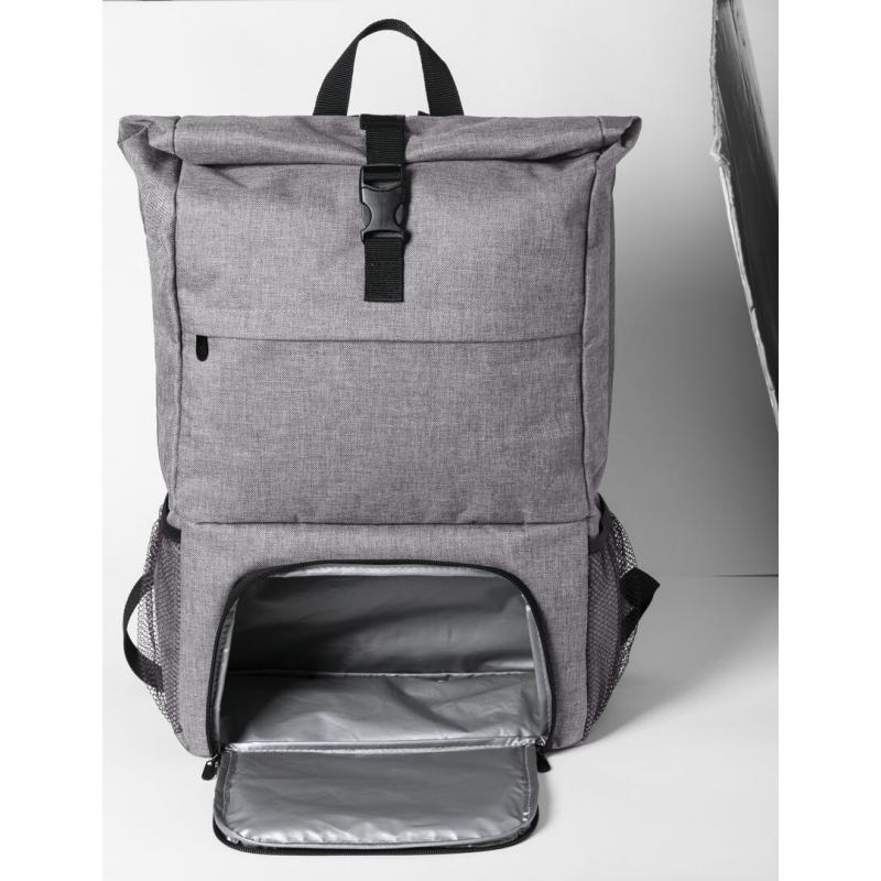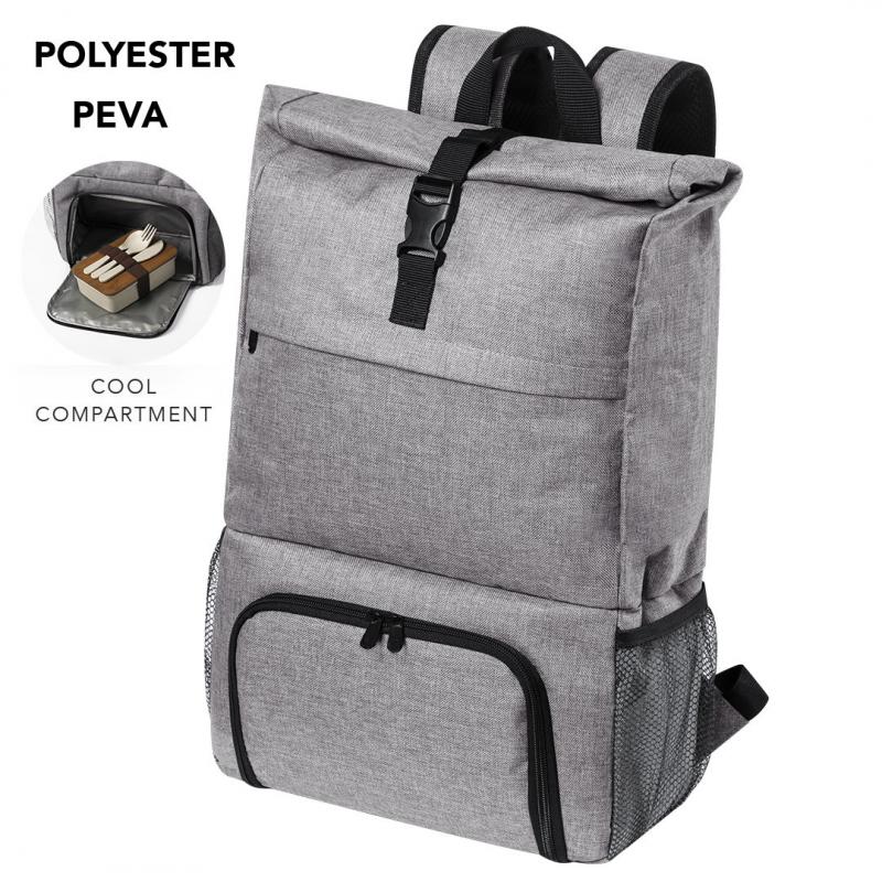 Mochila multiusos en resistente poliéster 600D de acabado denim. De diseño urbano, incluye compartimento isotérmico independiente con cobertura de PEVA para fiambrera. Compartimento principal con cierre de seguridad de hebilla y bolsillos laterales de redecilla. Con cintas de hombros acolchadas, de ajuste regulable.