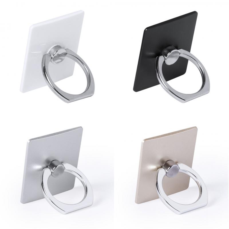 Soporte adhesivo para smartphone de diseño minimalista y elegante acabado en plateado y dorado. Con anilla posterior telescópica para dedo con función doble de soporte y accesorio para selfies.