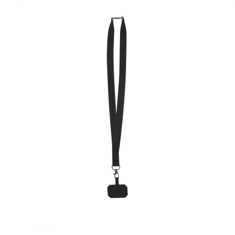 Original lanyard soporte en suave poliéster, adaptable por el accesorio de transporte para situar entre la funda y el smartphone. Cinta de transporte a juego, mosquetón metálico giratorio en color negro y dispone de accesorio de seguridad en el cuello.
