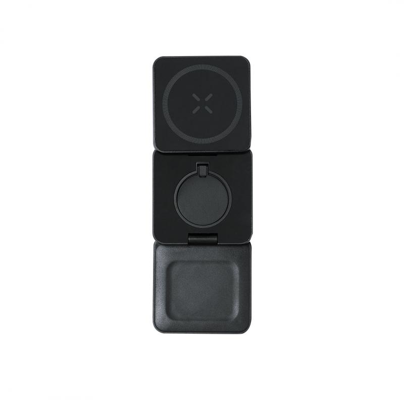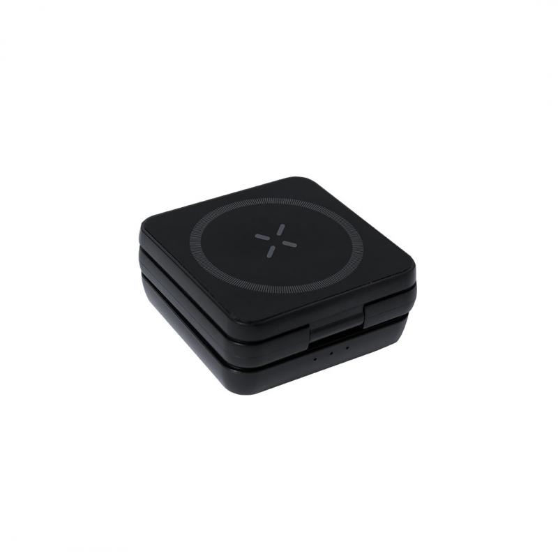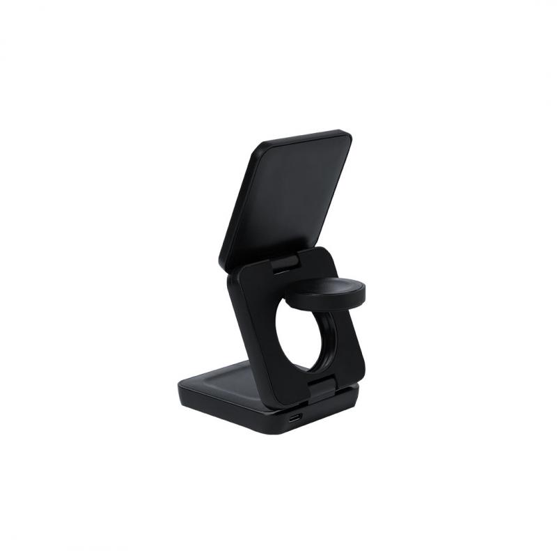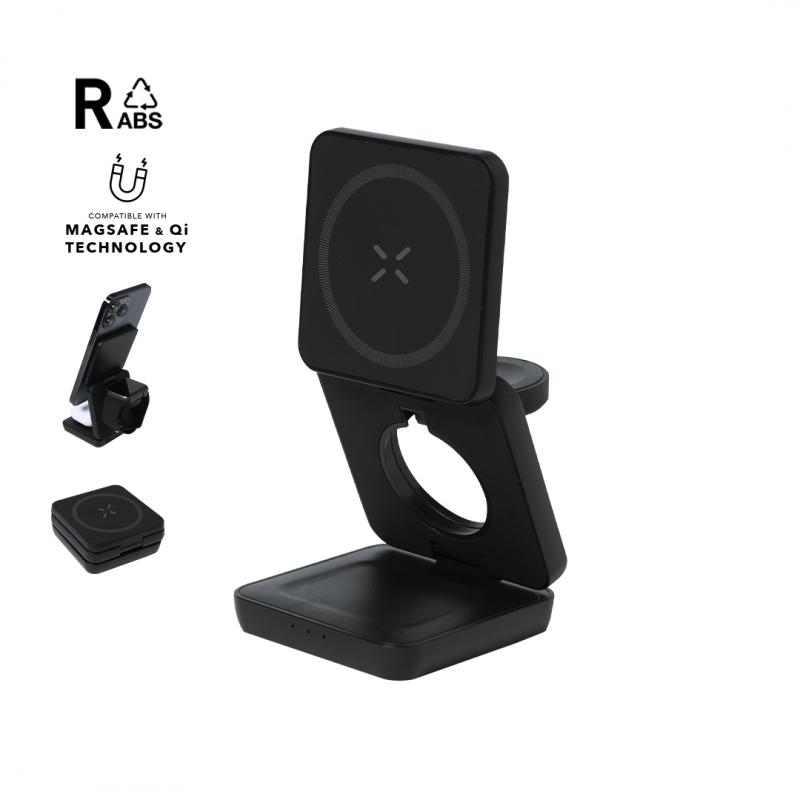 Cargador inalámbrico magnético 4 en 1 de 15W, fabricado en ABS reciclado (RABS). Diseñado para la carga simultánea del smartphone, auriculares, smartwatch y soporte. Un gadget todo en uno: plegable, portátil, de tamaño compacto, muy versátil y de diseño funcional. De acabado mate con tacto gomoso. Conexión por usb Tipo C -cable incluido-.El RABS es un plástico altamente reciclable de gran resistencia y con multitud de aplicaciones que lo convierten en una solución eco-friendly. Fabricado conforme a los estándares RoHS y en cumplimiento con los siguientes requisitos de seguridad:Sistema de protección contra sobrecalentamiento.Sistema de protección contra sobrecarga.Sistema de bloqueo para evitar cortocircuitos.