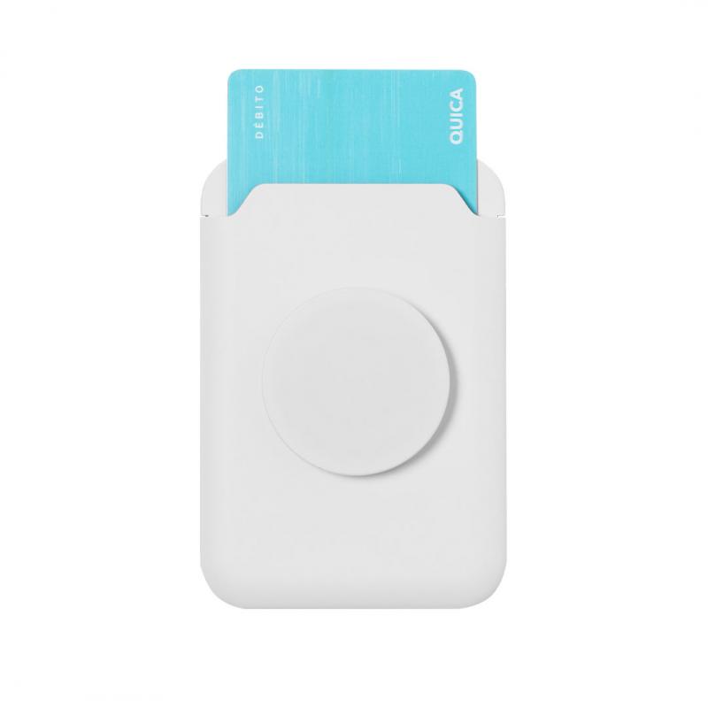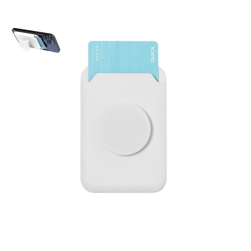 Tarjetero con soporte plegable para smartphone. Diseñado para guardar hasta dos tarjetas, incluye un aro metálico adhesivo para una sujeción y anilla extraible y ajustable para un mejor uso, en color abado brillo.