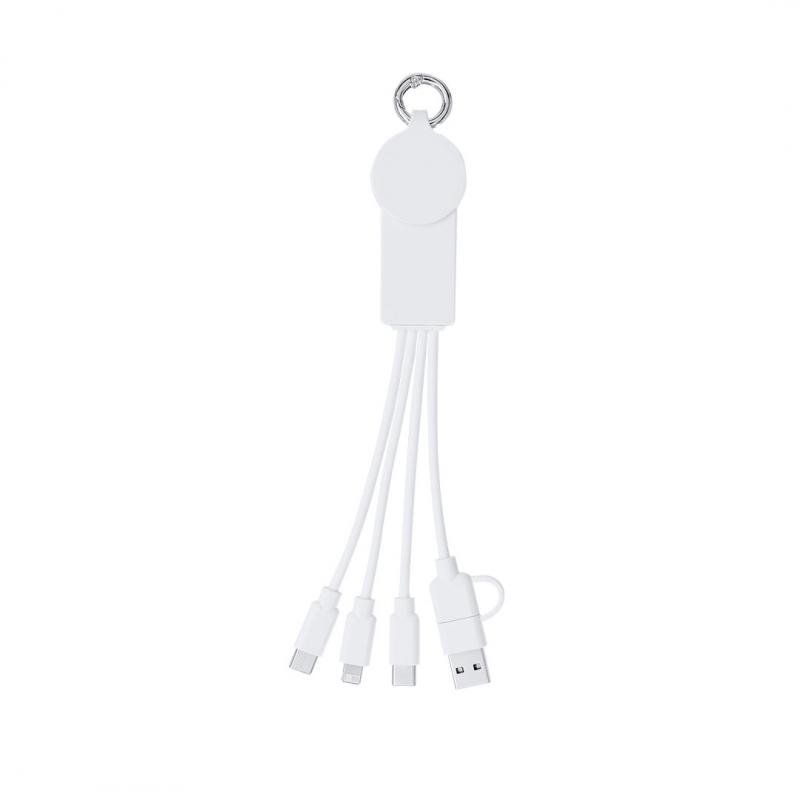 Cable cargador 5 en 1. Incluye conexiones de carga inalámbrica para smartwaches (Android e iOs), conexiones de entrada Tipo C y USB y de salida Tipo C y doble conector micro USB y Lightling.