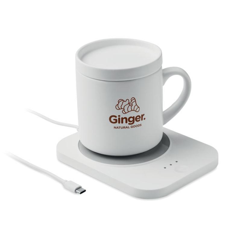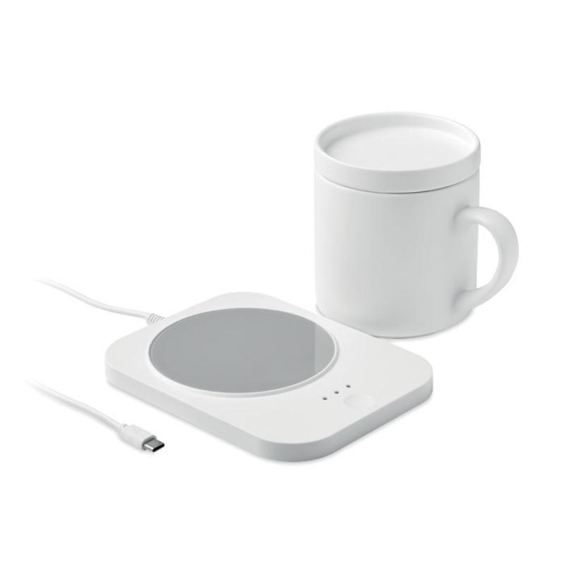 Cargador inalámbrico 2 en 1 de 15 W y calentador de tazas en ABS con taza de cerámica de 370 ml. Mantiene las bebidas calientes hasta un máximo de 50ºC. 3 ajustes de temperatura con pantalla táctil. Cable de conexión USB. Salida: CC 9V/1,67A (15W).Recipiente :