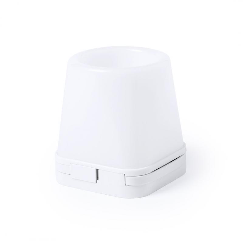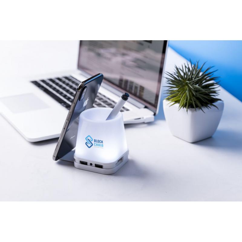 Original lapicero con puerto USB integrado. Retroiluminado por luz led, con 2 posiciones de iluminación y cuerpo en elegante color blanco para fácil marcaje. Incluye 4 puertos USB 2.0. Presentado en caja individual.