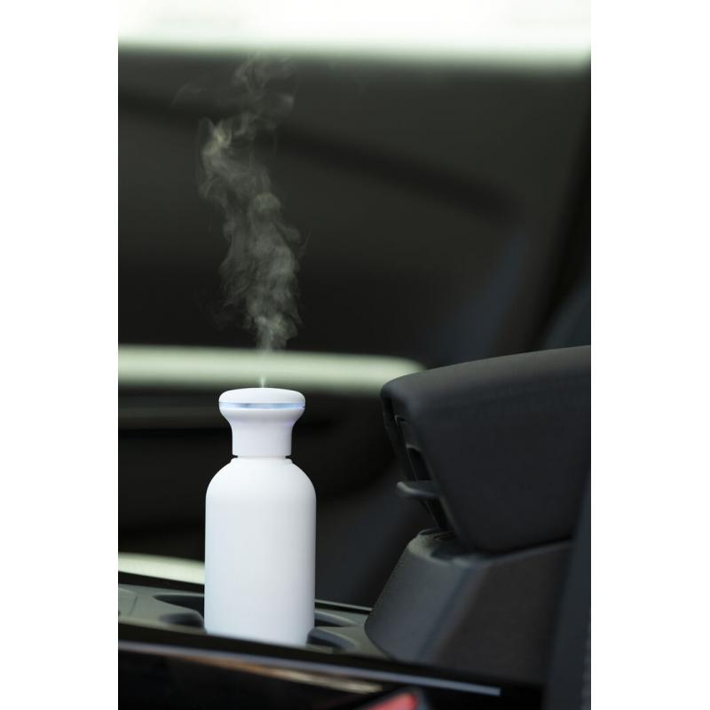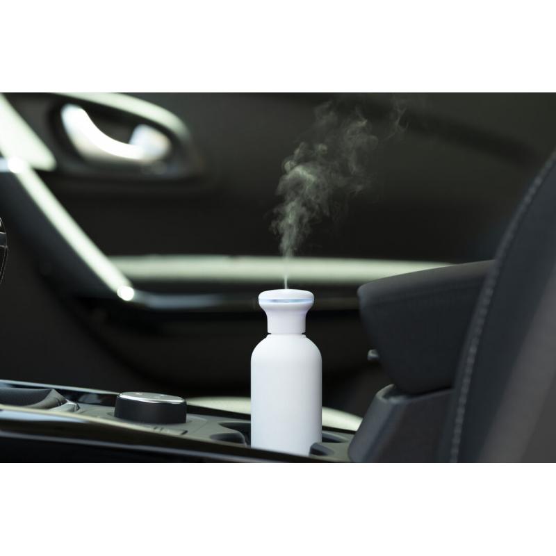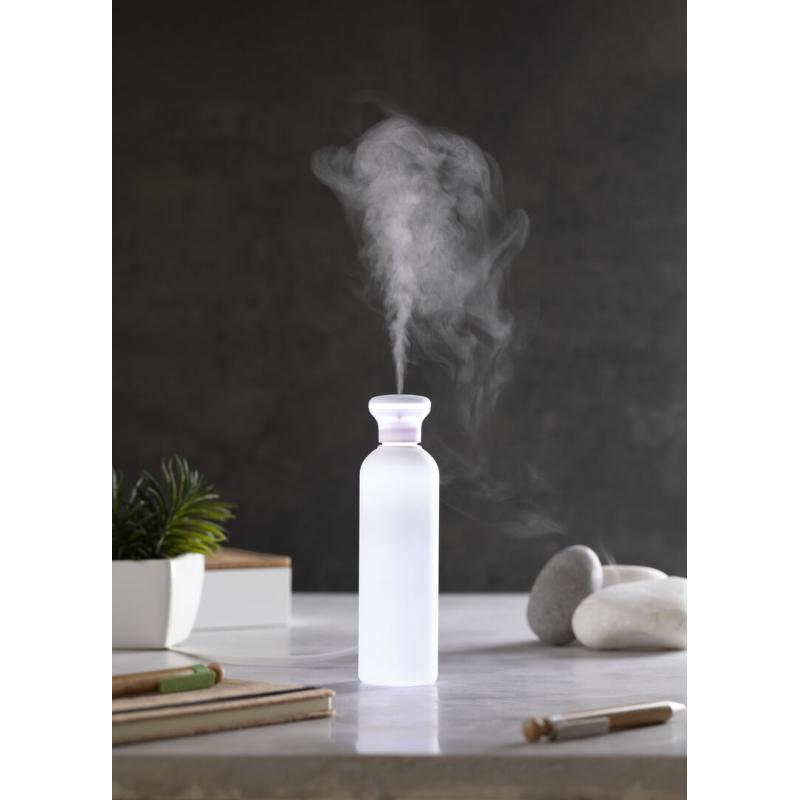 Elegante y decorativo humidificador con original diseño, disponible en acabado blanco y difuminado. Con suave tacto de goma y luz led blanca en el interior. 250ml de capacidad, con botón de encendido ON/OFF. Recomendado para uso en estancias de hasta 25m2, con 3 filtros de recambio y cable de alimentación USB (incluido). Presentado en bandeja protectora de PVC y en atractiva caja de diseño.