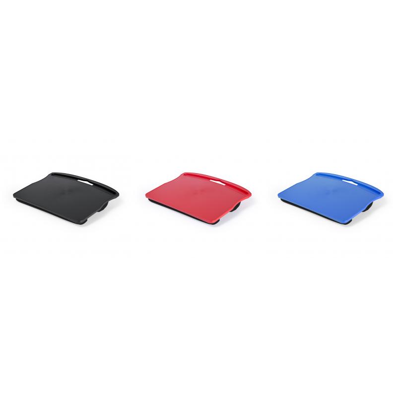 Práctico soporte para ordenador. Fabricado en material antideslizante, con marco de seguridad en los laterales. Zona de apoyo para las piernas con acolchado y asa de transporte incluida.