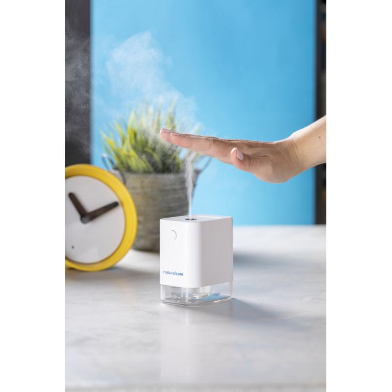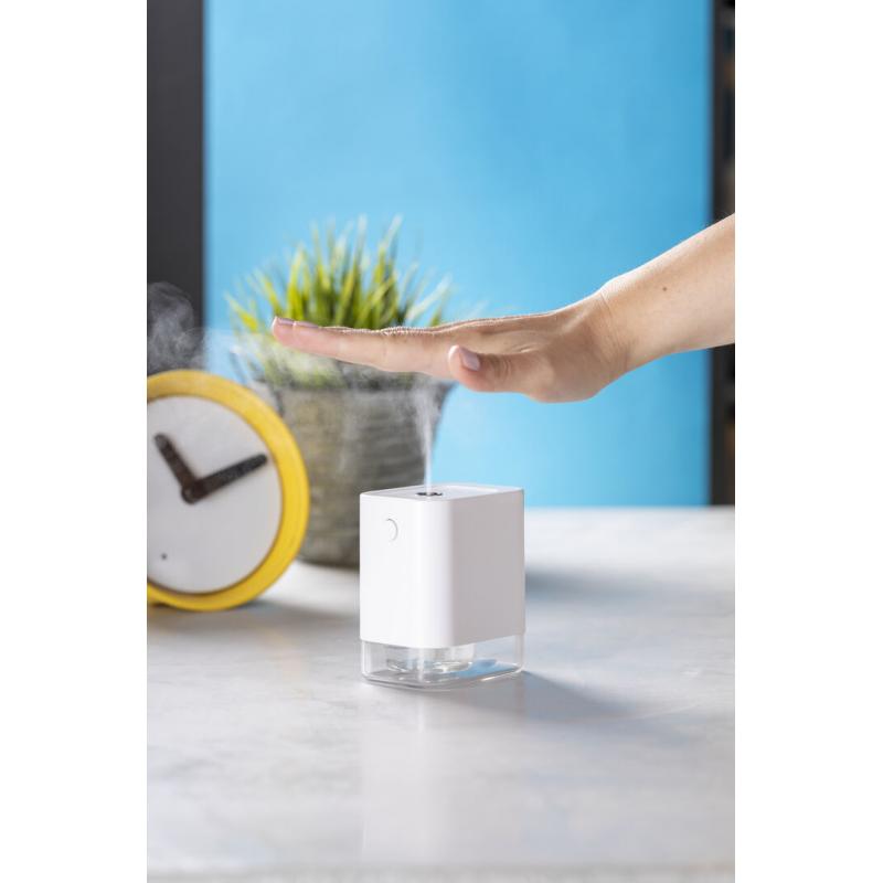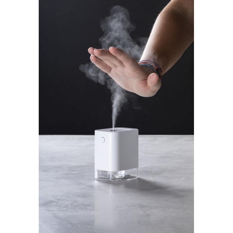 Dispensador automático de alcohol para higiene y limpieza de la piel, con sensor de movimiento de infrarrojos y led indicador. Tamaño compacto y discreto acabado en color blanco mate especialmente indicado para marcaje en tampografía, con depósito de 45 ml fácilmente rellenable (alcohol no incluido), más filtro y muelle de recambio. Batería de iones de litio de 1.800 mA y capacidad de conversión electrónica ≥ 90%. Recargable mediante cable USB tipo C de 1 metro de largo en color a juego,. Presentado en atractiva caja de diseño, disponible manual de instrucciones en español en inglés.