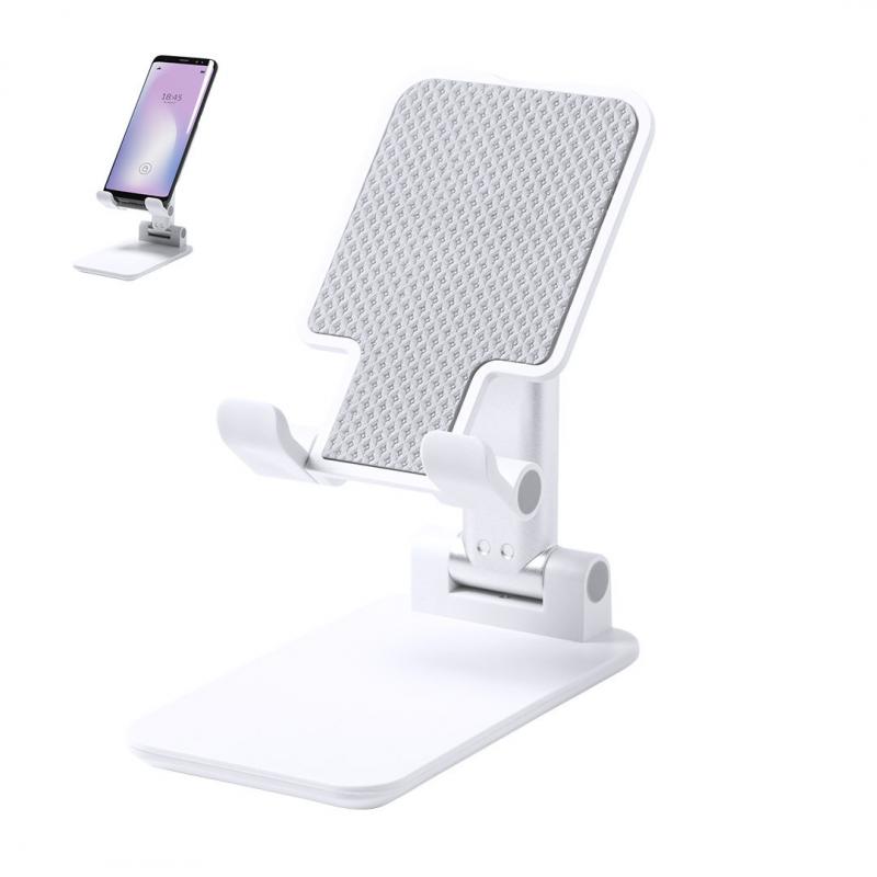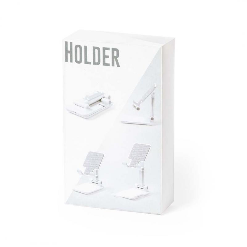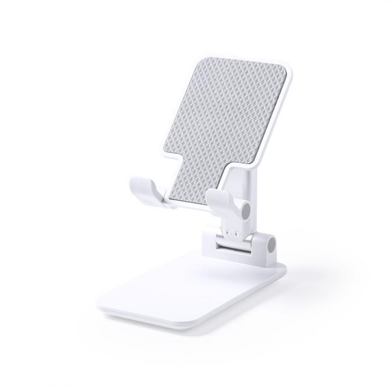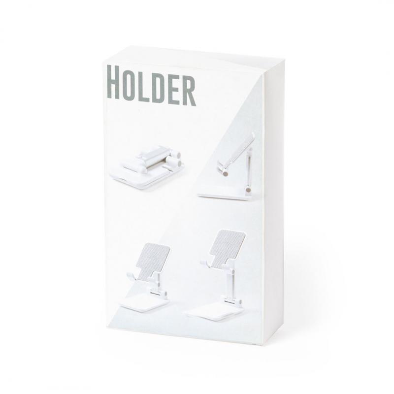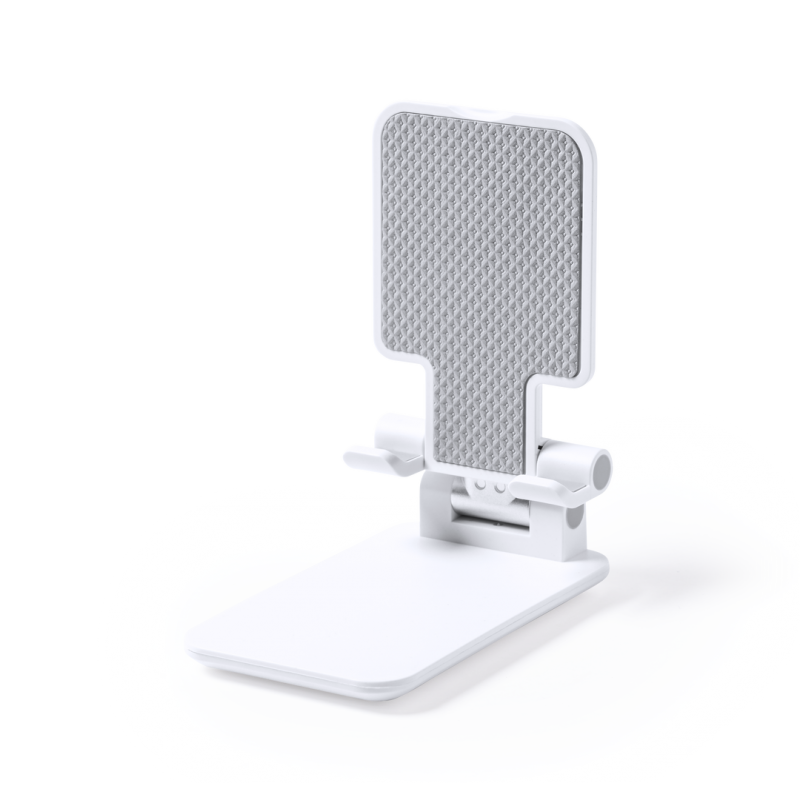 Soporte plegable para smartphones y tablets. Regulable en altura, incluye protecciones de goma antideslizantes en base y soporte. En sobrio acabado de color blanco y con amplia superficie de marcaje, especialmente indicado para impresión en tampografía. Presentado en atractiva caja de diseño.
