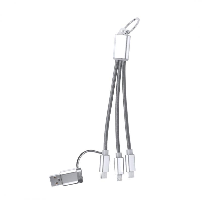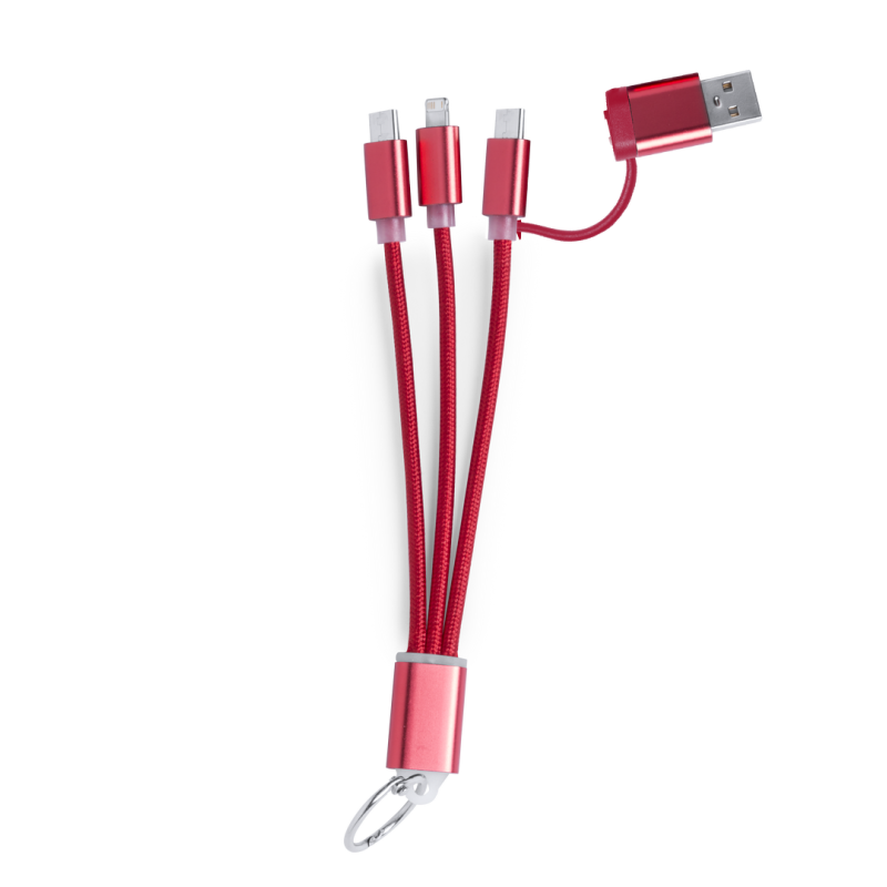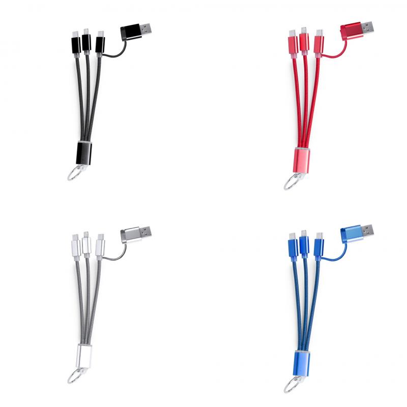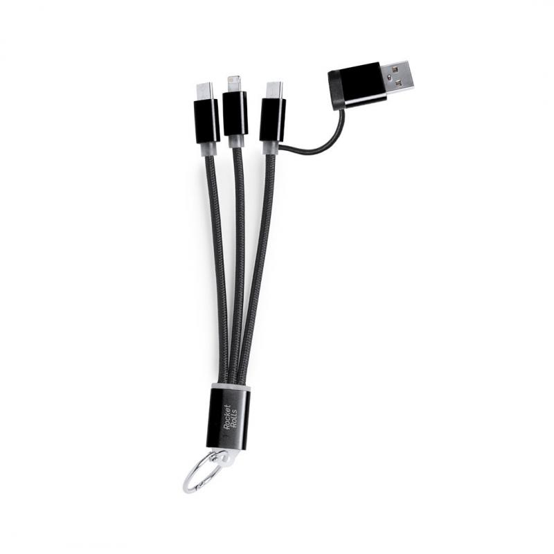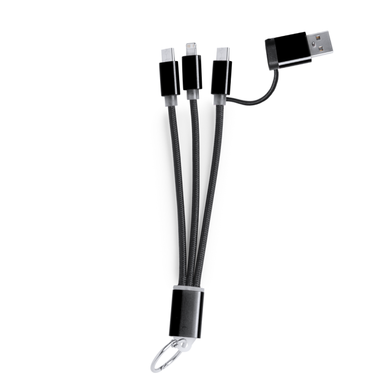 Cable cargador con conexión dual micro USB/Lightning y tipo C (entrada y salida). Conectores de aluminio y chapa especialmente diseñada para marcaje en láser.