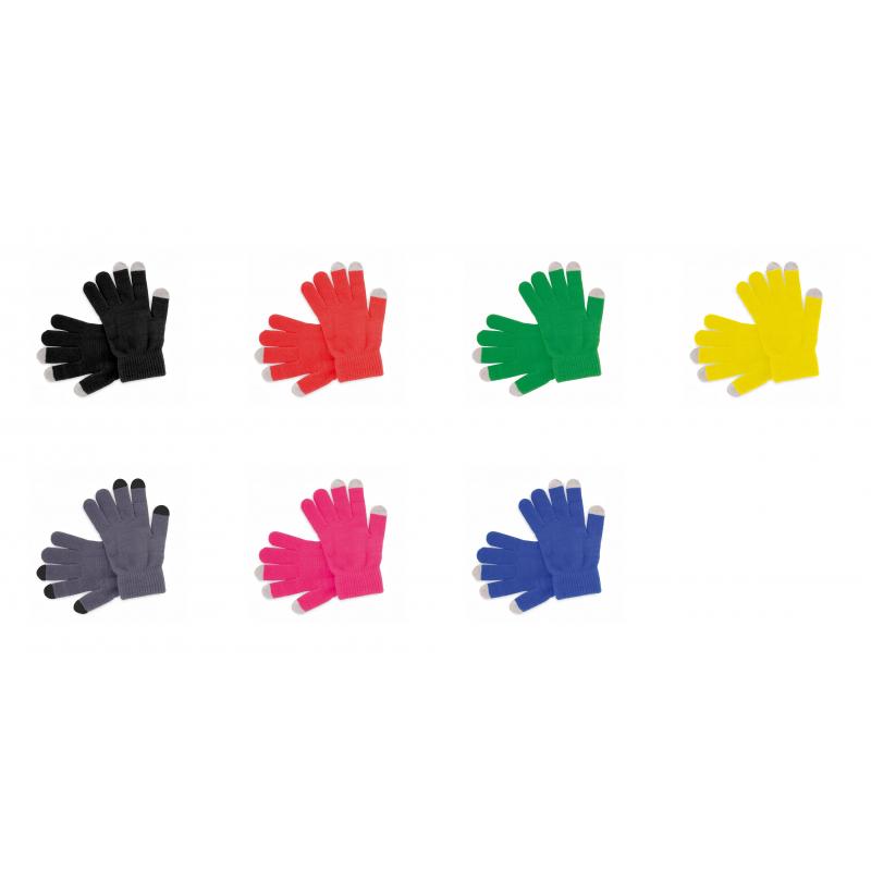 Práctico par de guantes para dispositivos con pantalla táctil, de cálido y suave acabalado acrílico y en divertidos colores. Integran puntero en dedos corazón, índice y pulgar. Talla única.