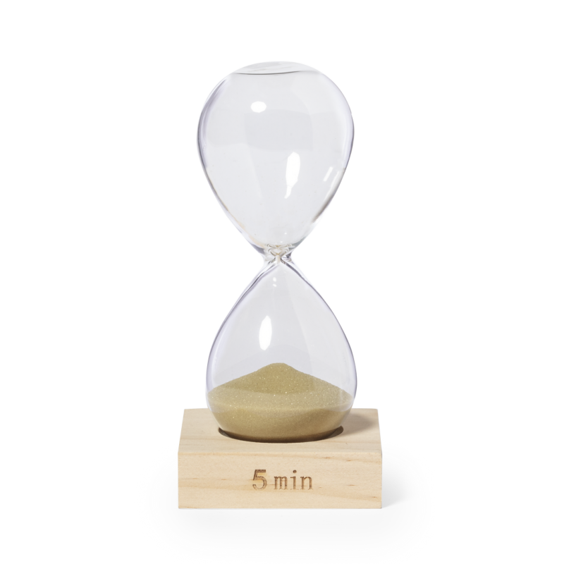 Reloj de arena de 5 minutos de duración. Fabricado en cristal de borosilicato, que ofrece una resistencia y durabilidad excepcionales, con base en madera de pino natural. Su elegante diseño y la arena en color natural lo convierten en un gadget decorativo y funcional, ideal para medir el tiempo. Presentado en una caja individual de diseño kraft.
