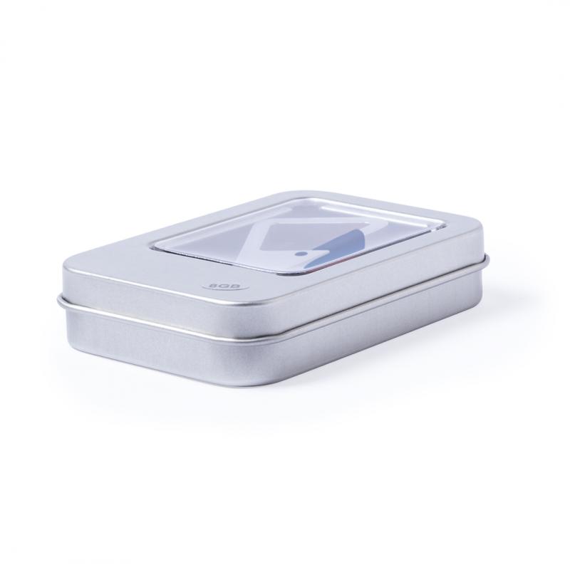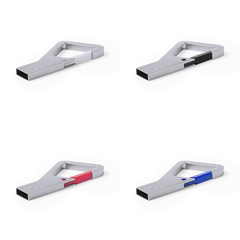 Memoria USB de 8GB de capacidad de acabado metálico y con original diseño de mosquetón con cierre en variada gama de colores. Presentada en estuche metálico individual con ventana e interior troquelado en suave espuma.