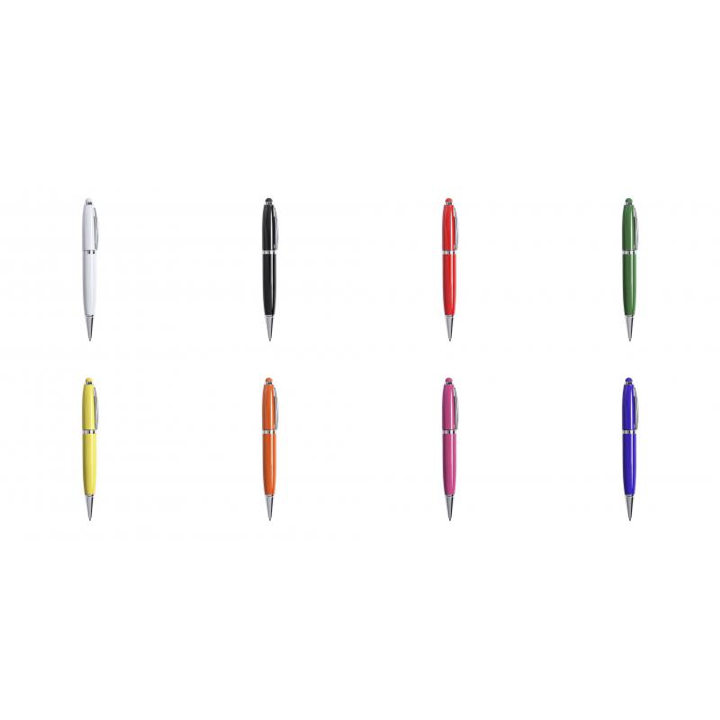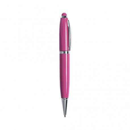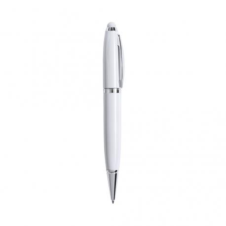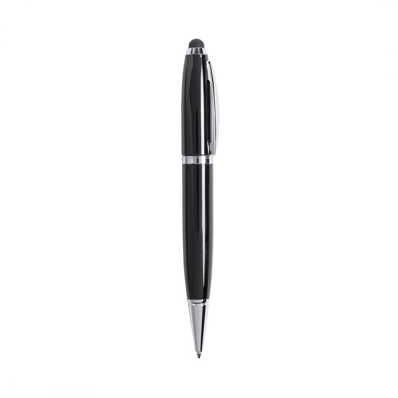 Bolígrafo tecnológico multifunción en sobrios colores, con memoria USB de 16GB de capacidad integrada en la capucha y puntero de suave goma a juego. Cuerpo en acabado métálico brillante, de apertura giratoria y con tinta azul. Presentado en elegante caja de cartón de color blanco con cierre magnético y suave espuma troquelada.