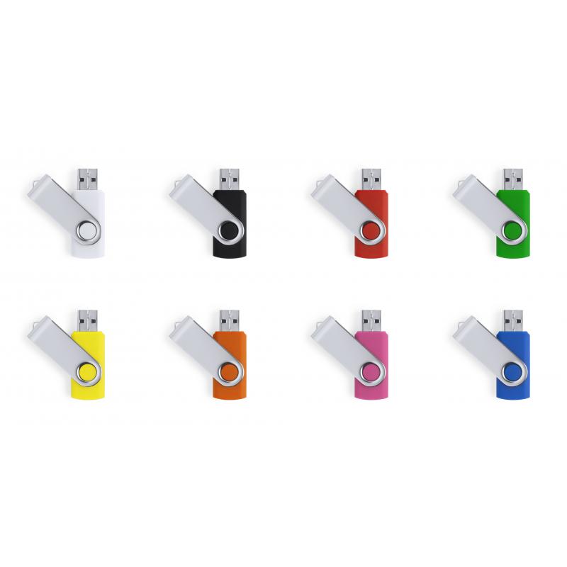 Memoria USB de 32GB de capacidad, con mecanismo giratorio, cuerpo de suave acabado y clip metálico. Disponible en una original gama de colores. Presentada en estuche individual.