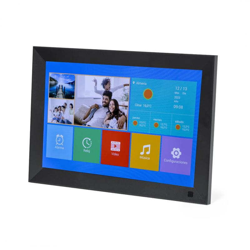 Marco de fotos digital de 10,1 pulgadas. Con pantalla táctil IPS de alta resolución de 1280x800 píxeles, conectividad WiFi, y equipado con funciones inteligentes como visualización del tiempo, alarma y reloj. Ademas incorpora un menú para explorar un mundo de posibilidades al ver videos, fotos y escuchar música, con opción de visualización en formato horizontal y vertical. Con soporte en la parte trasera y ranuras para colgar en la pared. Alimentación CA 220V-240V, con cargador incluido. Presentado en caja de diseño kraft y disponible manual de instrucciones en español e inglés.