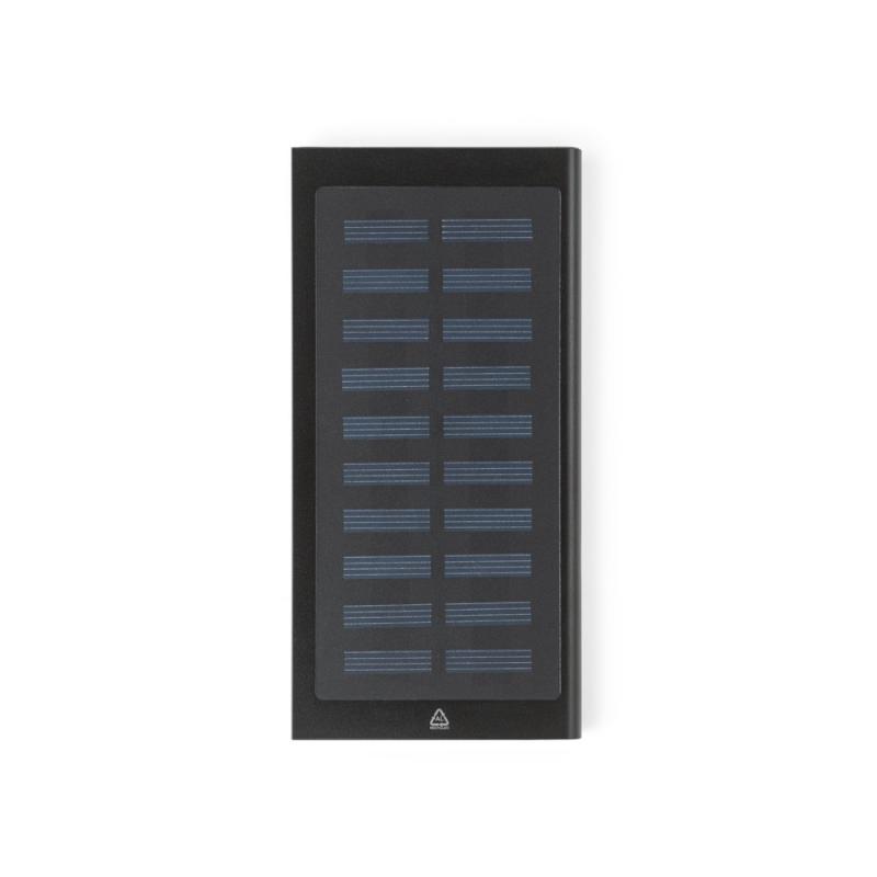 Batería portátil fabricada en aluminio (100% reciclado) y batería de litio. La batería incluye un panel solar y una linterna. Tiene una capacidad de 8.000 mAh y una vida útil de más de 500 ciclos. Dispone de entrada USB-C y salida USB-C y USB-A para cargar la batería. Incluye cable de carga USB-A/USB-C de 30 cm. Ideal para situaciones de emergencia. Se envía en una caja de regalo de papel kraftRecipiente :