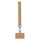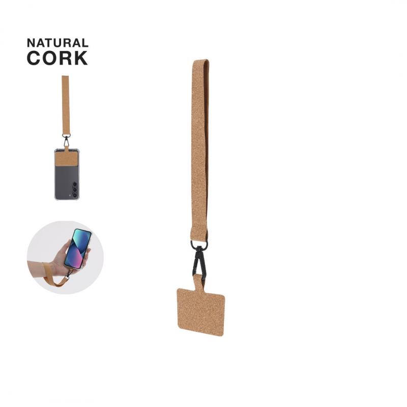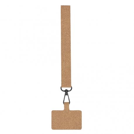 Pulsera soporte para smartphone fabricada en corcho. Con cinta de transporte a juego y mosquetón metálico giratorio en color negro. Elaborado con elementos vegetales para así fomentar la utilización de materias primas naturales y reducir las emisiones contaminantes.