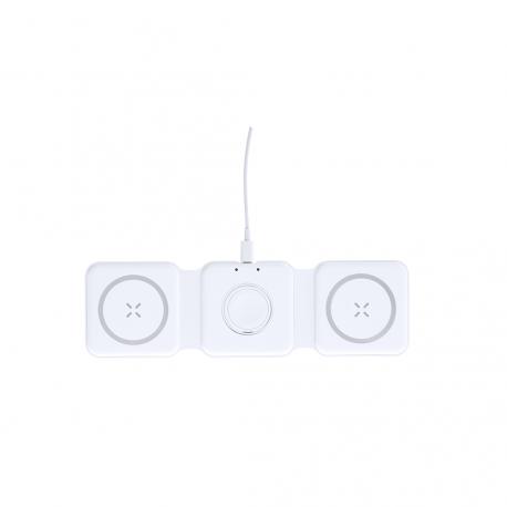 Completo cargador inalámbrico magnético 15W, diseñado para la carga simultánea del smartphone, auriculares y smartwatch. Un gadget todo en uno: plegable, portátil, de tamaño compacto, muy versátil y de diseño funcional. Conexión por usb Tipo C -cable incluido- y elaborado en resistente ABS de color blanco. Fabricado conforme a los estándares RoHS y en cumplimiento con los siguientes requisitos de seguridad:Sistema de protección contra sobrecalentamiento.Sistema de protección contra sobrecarga.Sistema de bloqueo para evitar cortocircuitos.