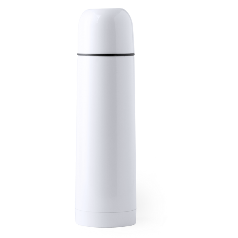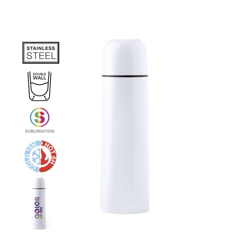 Termo de 500ml de capacidad en resistente acero inox. Superficie exterior especialmente diseñada para marcaje en sublimación. Con tapón de seguridad y presentado en atractiva caja individual de diseño.