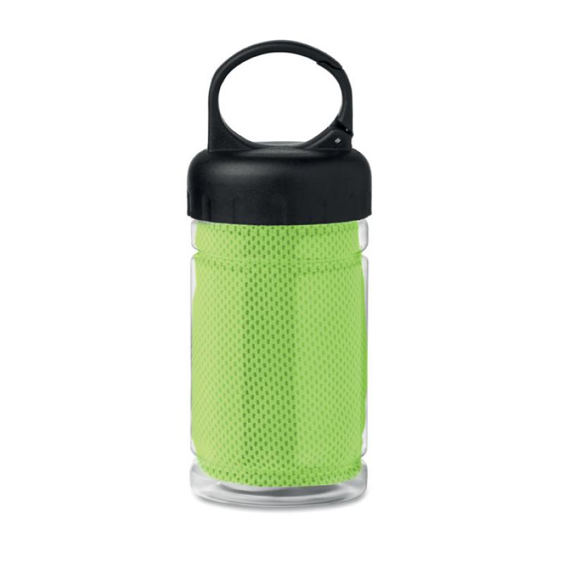 Toalla deportiva de microfibra, presentada en envase individual de PET transparente con tapa con mosquetón de transporte integrado.
