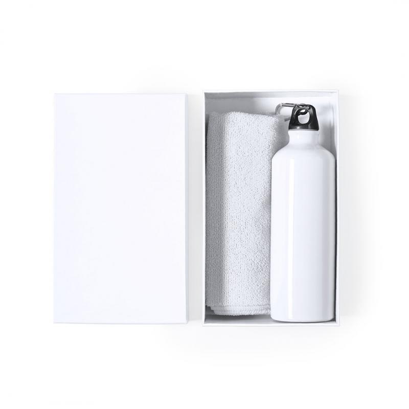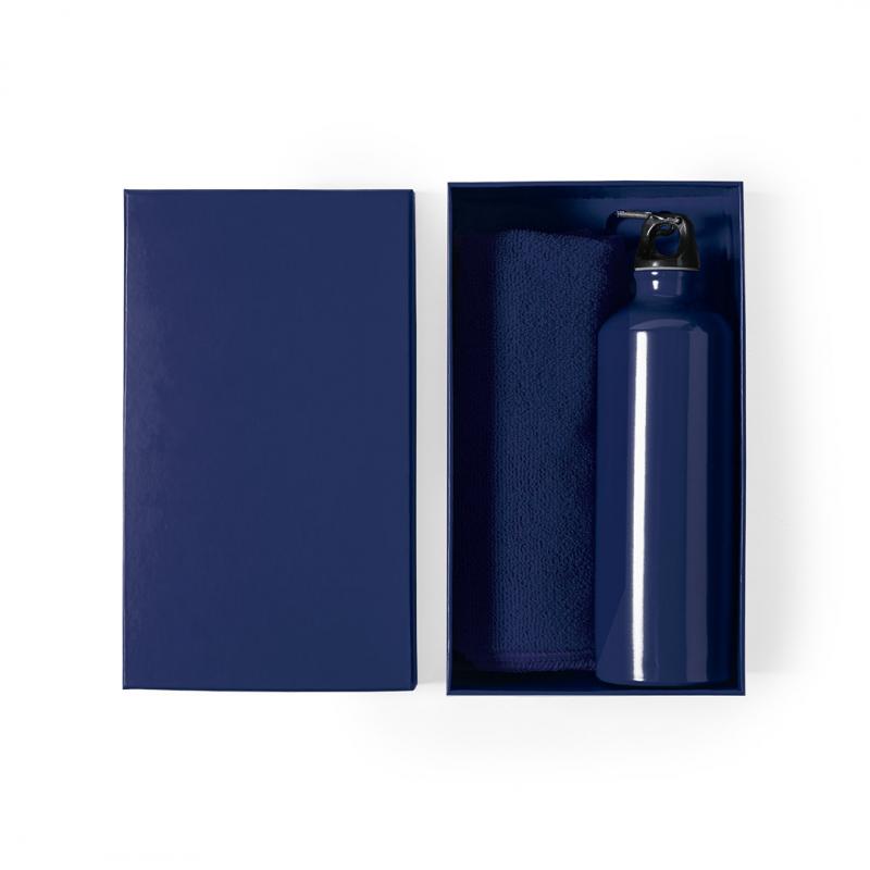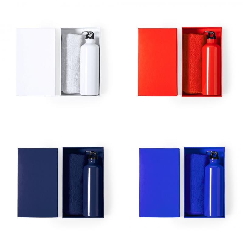 Set de bidón y toalla a juego. Incluye: Bidón de 800 ml de capacidad con cuerpo en aluminio de acabado brillo. Con tapón de seguridad a rosca y mosquetón metálico de transporte. Toalla absorbente fabricada en microfibra de 160g/m2 y tamaño 40x90 cm. Set disponible en variada gama de colores y presentado en caja de cartón con colores a juego.
