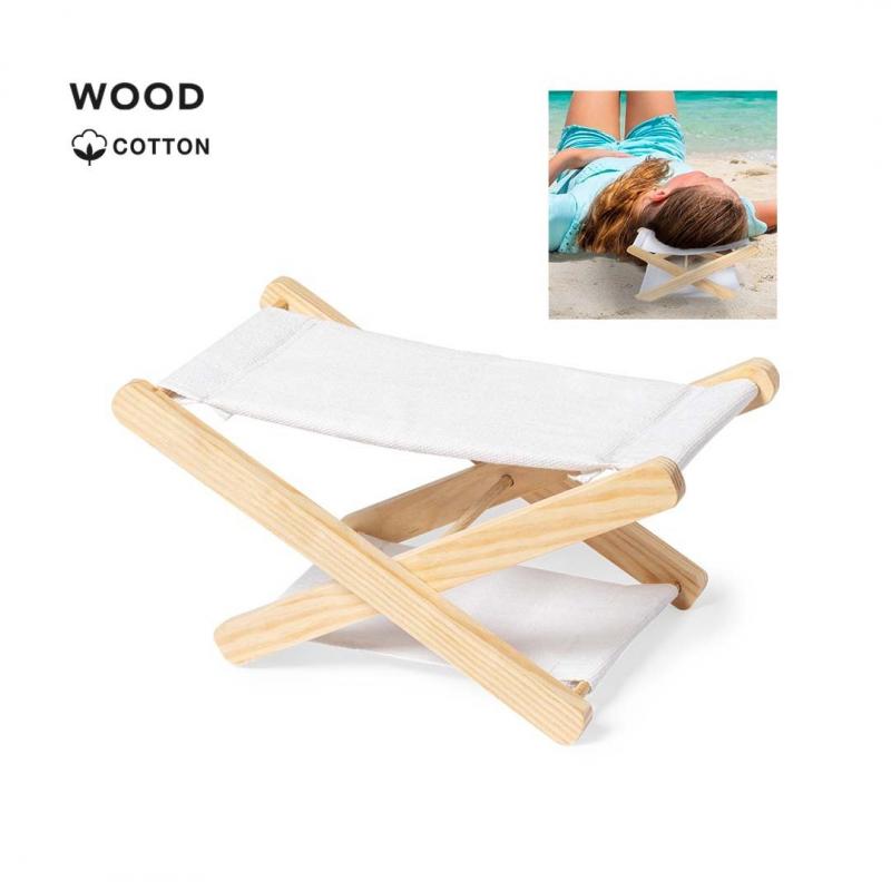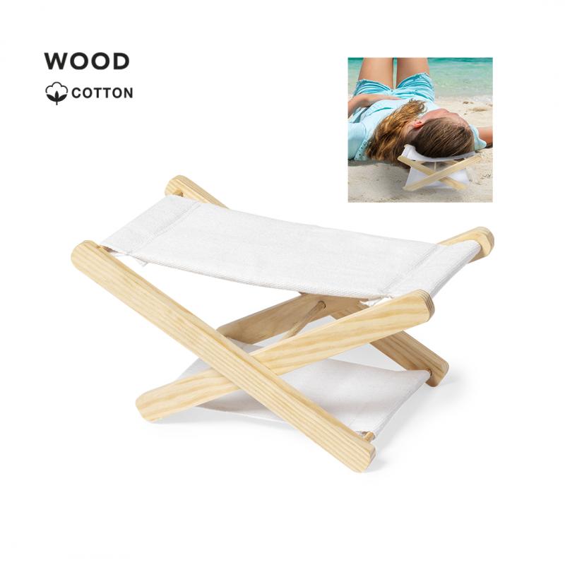 Original reposacabezas plegable, con estructura fabricada en madera y tela en 100% algodón de acabado natural.