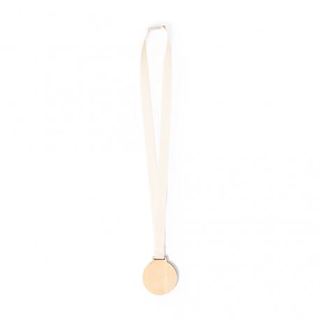 Medalla de línea nature fabricada en madera natural. Cordón fabricado en 100% algodón, con cierre de seguridad de fibra de trigo en el cuello.