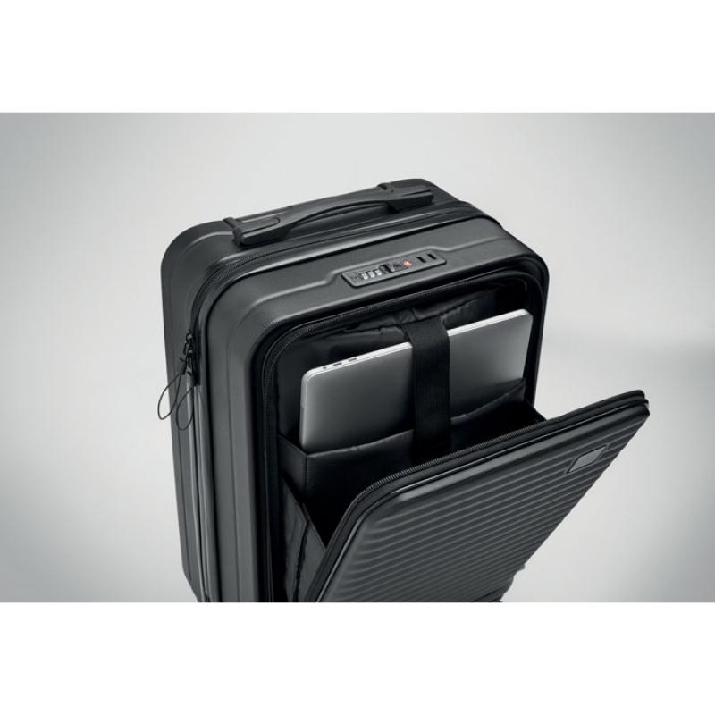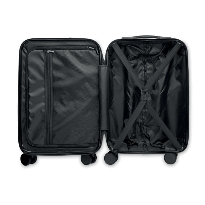 Trolley rígido de 20'' en ABS. 1 compartimento principal con compartimento interior. Compartimento frontal adicional con cremallera para documentos y compartimento acolchado para portátil de 15''. Cierre de seguridad (TSA). Medida: 33.5x23.5x56.5cm incluida las 4 ruedas.Recipiente :