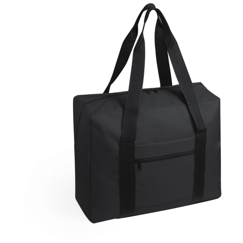 Bolso multiusos en resistente poliéster 600D y desenfadado diseño bicolor. Compartimento principal con cierre de cremallera y doble tirador, con accesorio de ajuste en trolley, resistentes asas de nylon y bolsillo lateral de cremallera.