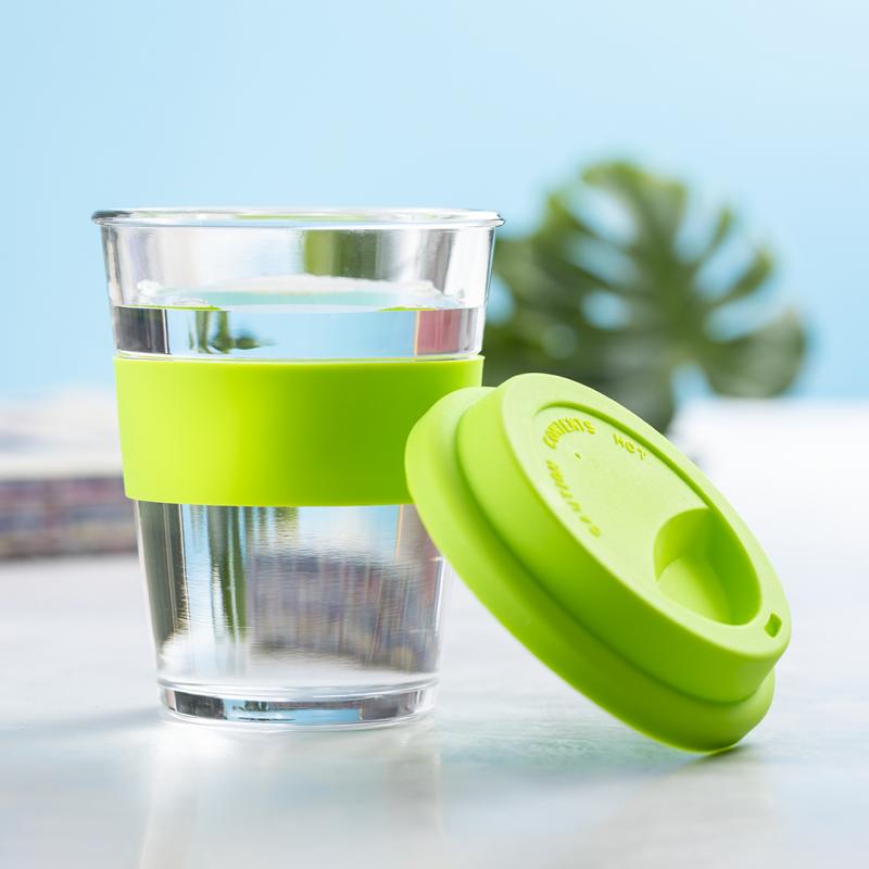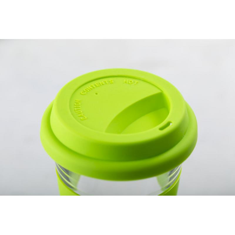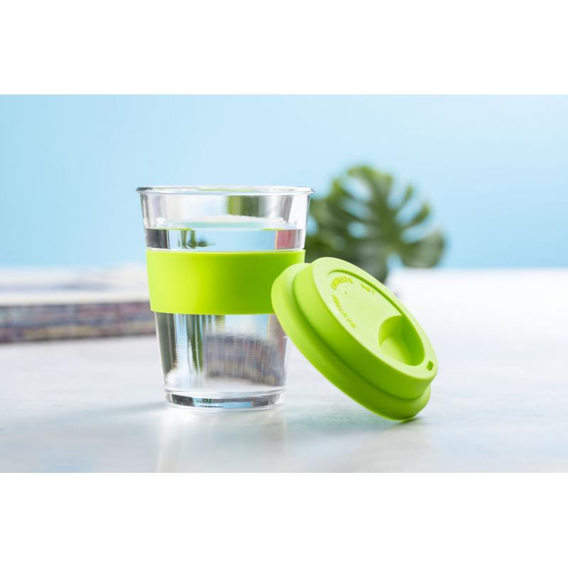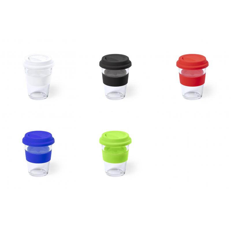 Vaso de cristal y 350ml de capacidad. Con tira antiquemaduras y tapa de silicona a juego en variada gama de colores. Presentado en caja individual de atractivo diseño.