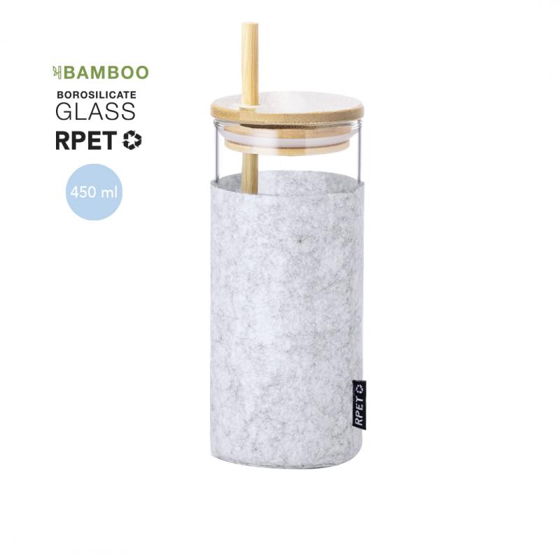 Vaso de alta calidad y 450ml de capacidad. Cuerpo fabricado en cristal de borosilicato, libre de BPA, que ofrece una resistencia y durabilidad excepcionales, alargando su vida útil y pudiendo ser reutilizado infinidad de veces. Incluye funda en suave y sostenible fieltro RPET, tapón de bambú a presión con orificio para pajita, y pajita reutilizable de bambú. Con etiqueta distintiva RPET. Presentado en caja individual de diseño eco.El fieltro RPET reciclado es fruto de la combinación del proceso de reciclaje de materiales plásticos junto a la técnica milenaria de fabricación del fieltro, dando como resultado un material de eco-tendencia que, además de ser de origen reciclado, también se convierte en reciclable.