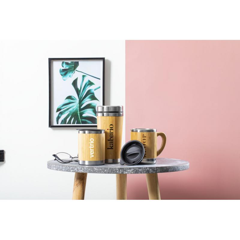 Vaso de línea nature y 300ml de capacidad. Cuerpo en combinación bambú y acero inox de doble pared para mejor y más duradera conservación de la temperatura. Con original tapón dosificador en negro y presentado en atractiva caja de diseño eco.