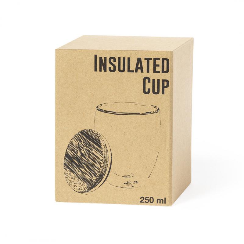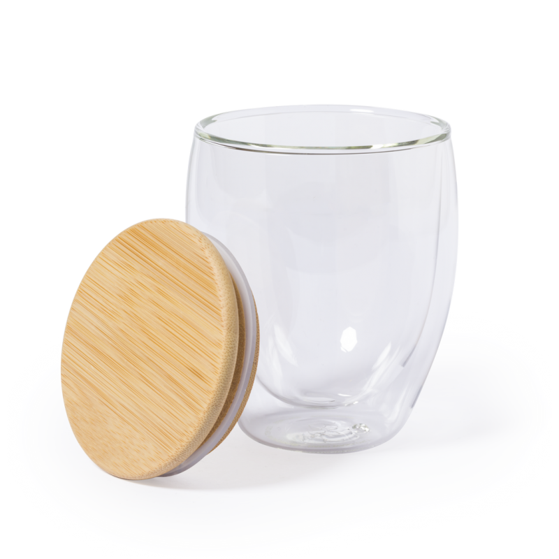 Vaso térmico de línea nature en alta calidad, de doble pared y 250ml de capacidad. Fabricado en cristal de borosilicato, que ofrece una resistencia y durabilidad excepcionales, alargando su vida útil y pudiendo ser reutilizado infinidad de veces. Tapa en bambú y presentado en atractiva caja de diseño eco.