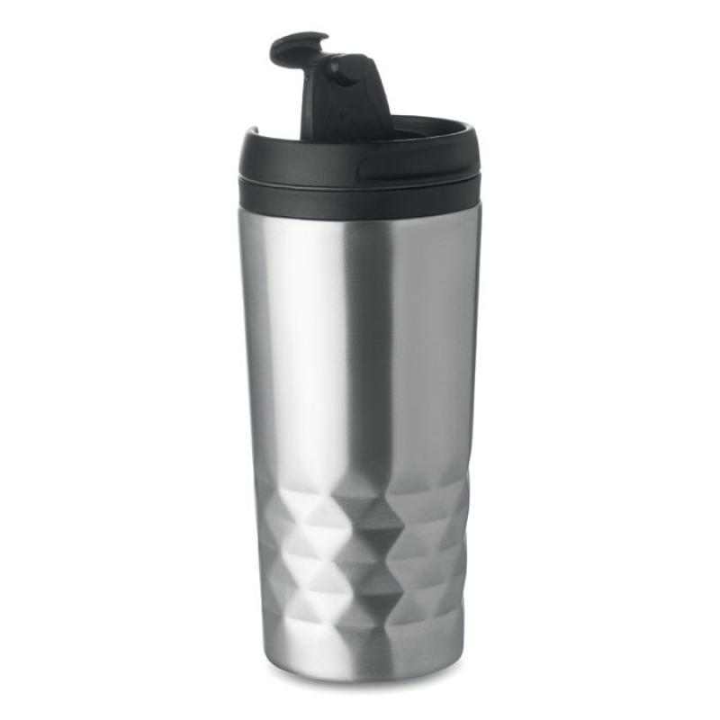 Vaso de viaje de doble capa en acero inoxidable en acabado corte diamante con interior y tapa en PP. Capacidad: 280 ml.