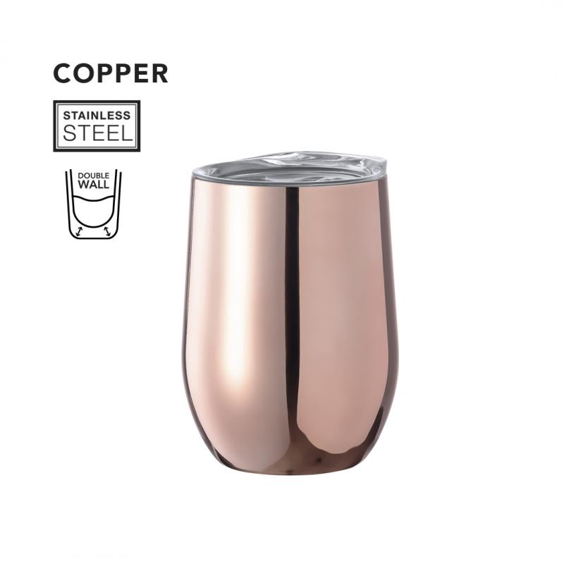Vaso térmico de acero inox de doble pared y 350ml de capacidad, con recubrimiento exterior de cobre galvanizado. Dosificador en tapa y libre de BPA. Presentado en caja individual negra de diseño.
