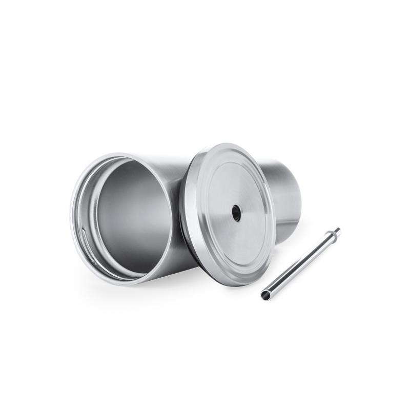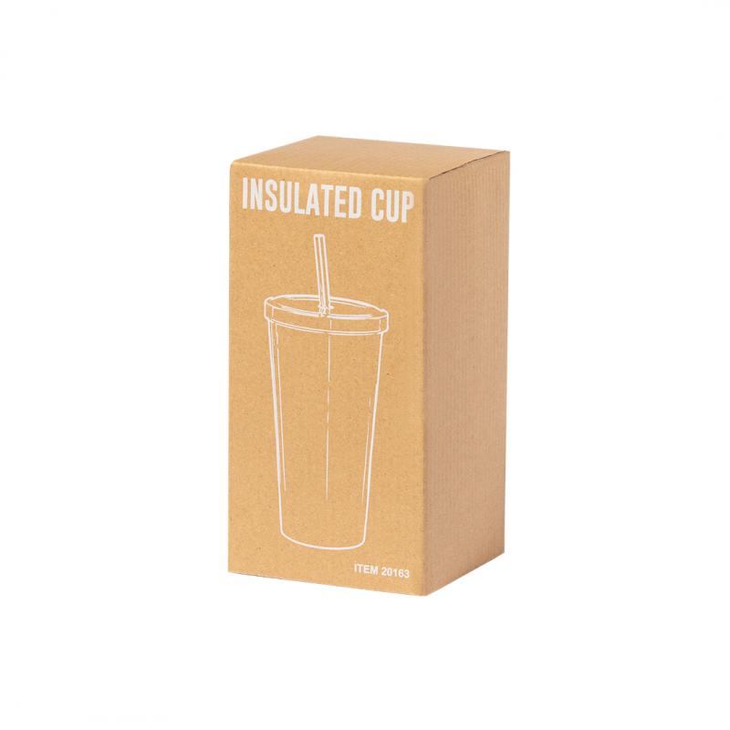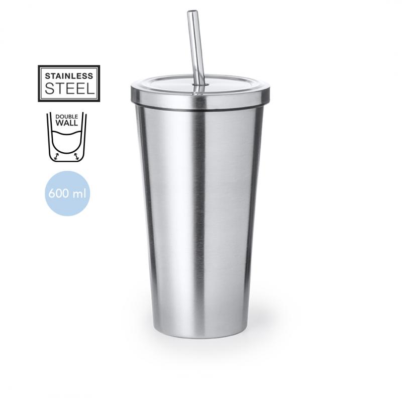 Elegante vaso térmico de acero inoxidable de doble pared y 600 ml de capacidad. De acabado mate, con tapa a rosca y pajita a juego. Presentado en caja individual de diseño kraft.