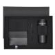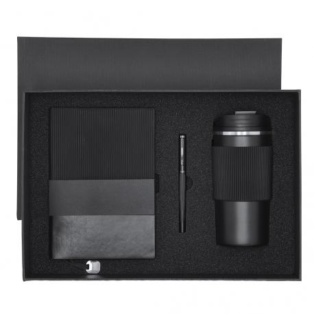 Elegante set premium. Incluye: Vaso térmico fabricado en acero inoxidable de doble pared con capacidad de 470 ml. Con un dosificador en tapadera, libre de BPA, sistema de apertura abre fácil, banda de silicona a juego y base antideslizante. Bloc de notas con tapas blandas fabricado en elegante PU color negro. Su diseño combina texturas lisas y biseladas. Incluye marcapáginas de tela con accesorio metálico especial para marcaje en láser. Interior con 100 hojas en color crema, de disposición a una raya y bordes en negro. Roller de acabado negro mate con detalles metálicos en color plata. De cuerpo biselado, con cierre de capucha, clip y tinta azul. Cuenta con cómodo agarre en metal pulido. Presentado en sosfisticado estuche individual de acabado mate, con interior troquelado para cada uno de los elementos del set.