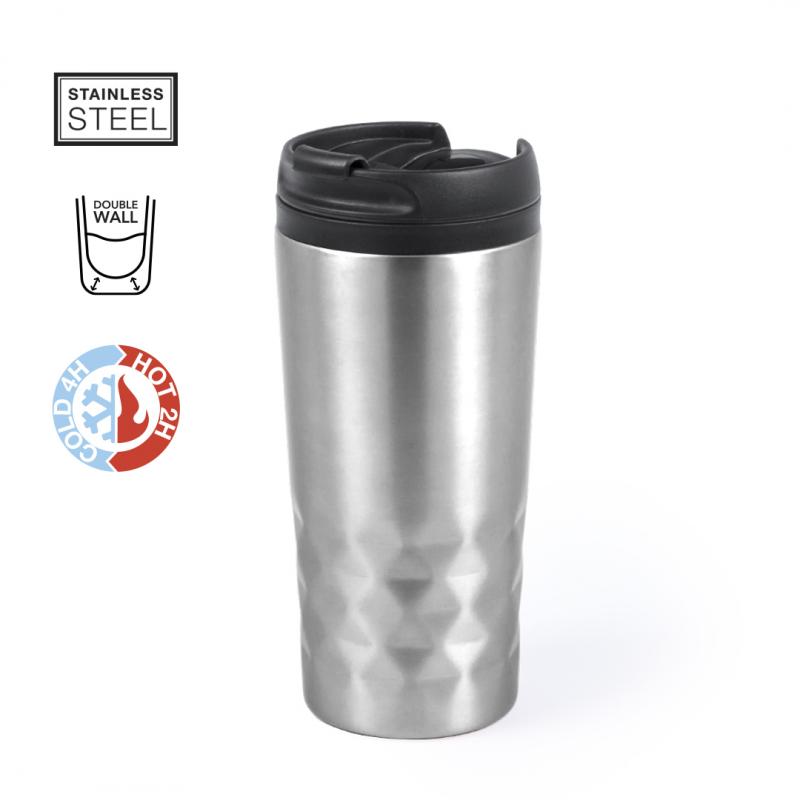 Vaso de acero inox de 310ml de capacidad. Con tapa dosificador de seguridad y base acolchada de suave espuma. De original acabado brillante y diseño en rombos, disponible en una variada gama de colores. Presentado en caja de diseño individual.