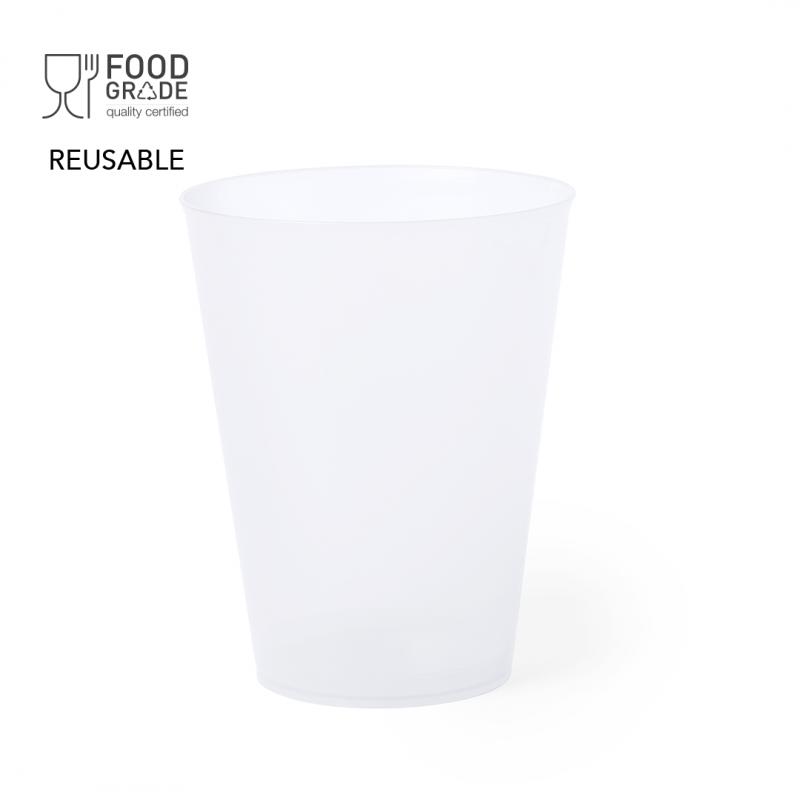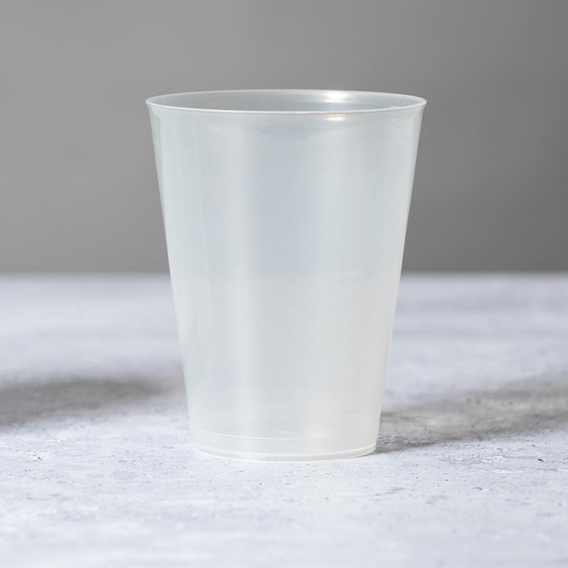 Vaso de 500ml de capacidad en resistente y flexible material PP. Reutilizable y en acabado translúcido.