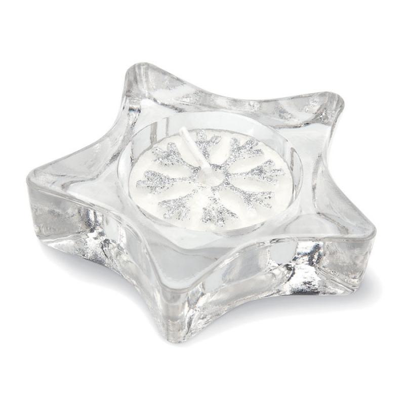 Porta velas de cristal en forma de estrella, presentado en caja plateada con tapa transparente y lazo de decoración. Vela de té incluida.Recipiente :