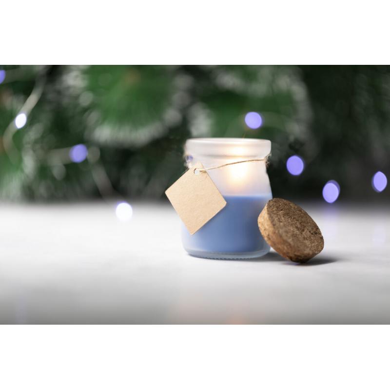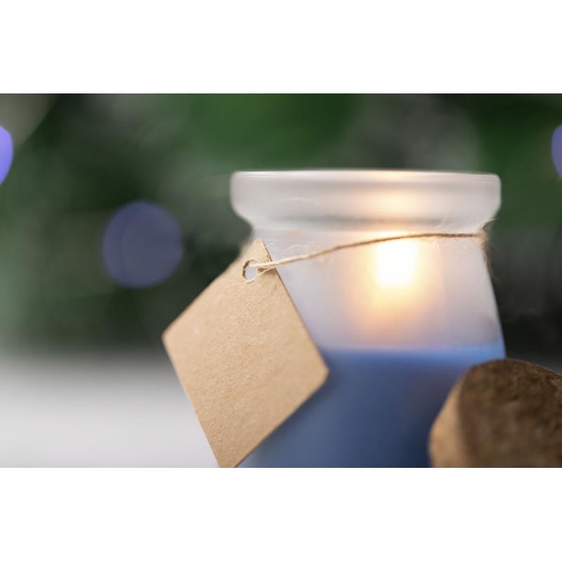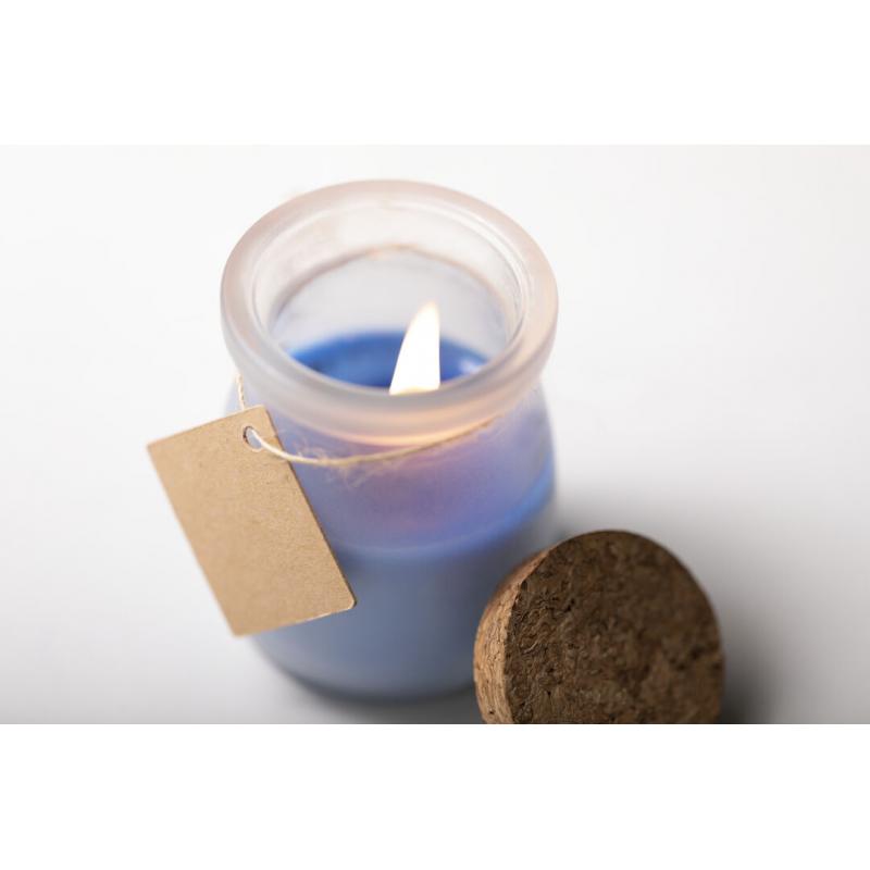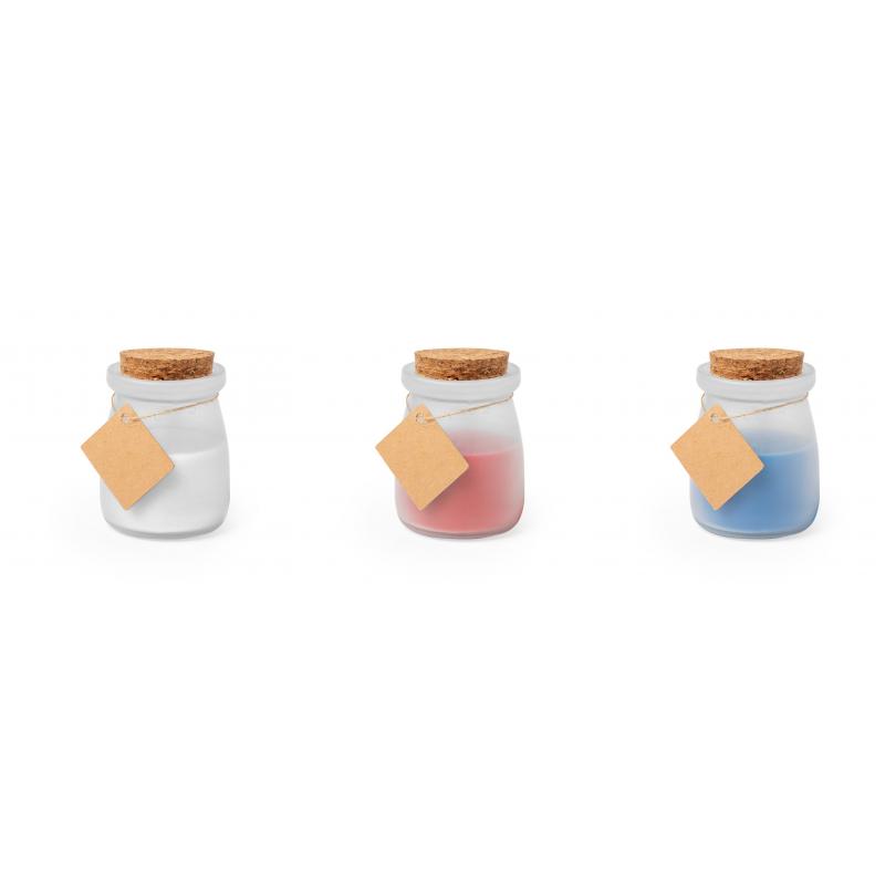 Original vela tarrito de cristal. Con tapón de corcho y etiqueta de cartón reciclado con hilo para mensajitos. Disponible en varios colores y presentada en caja blanca individual.