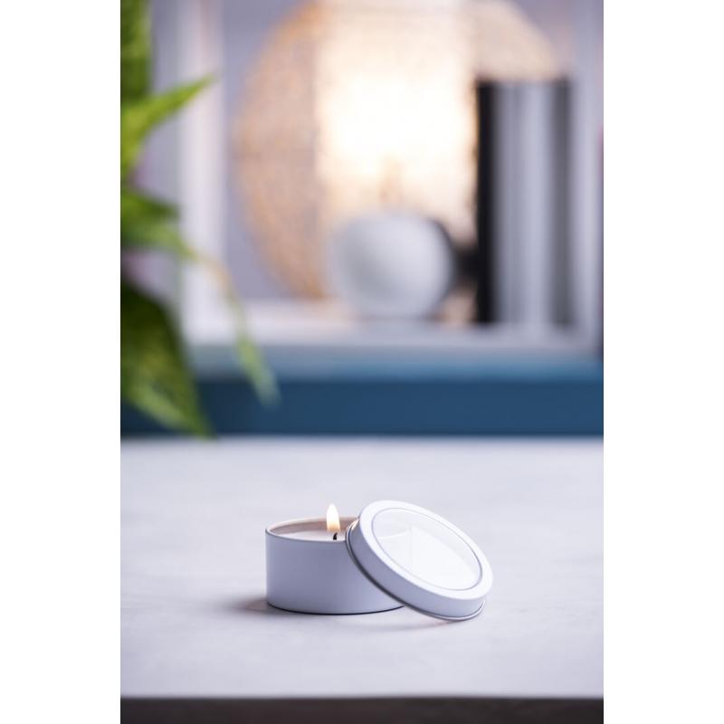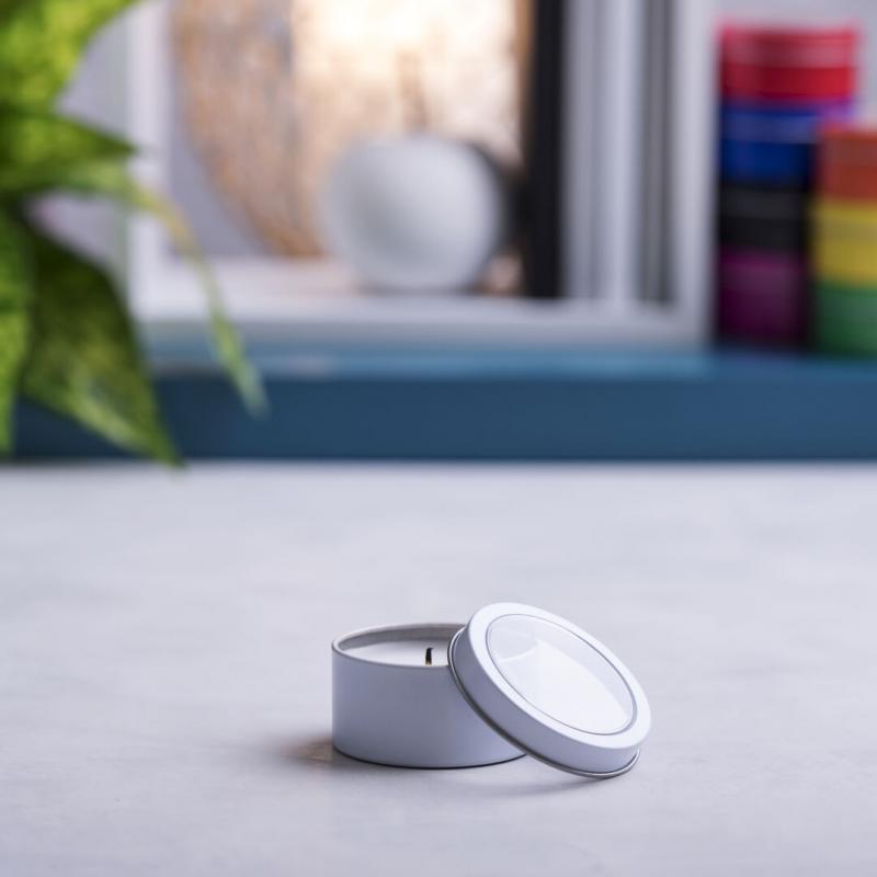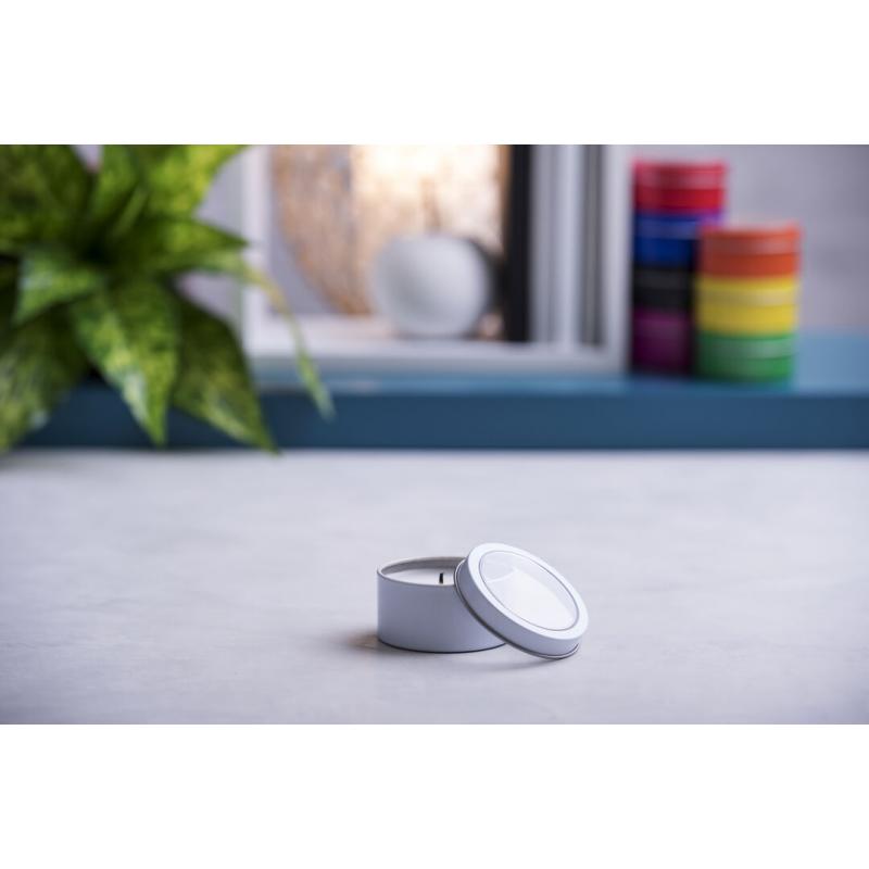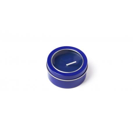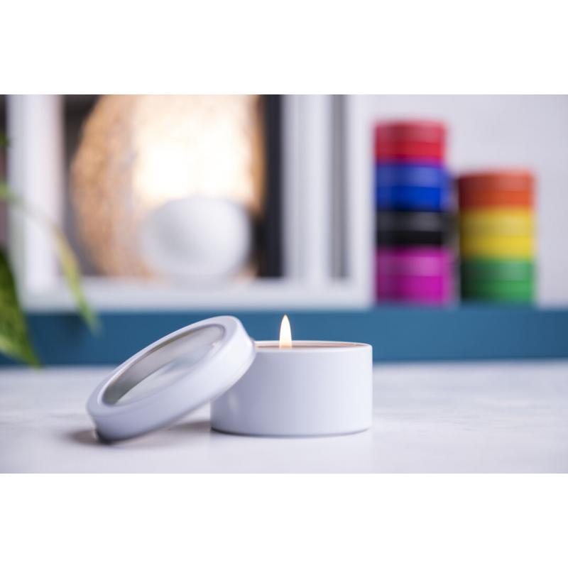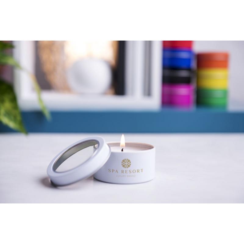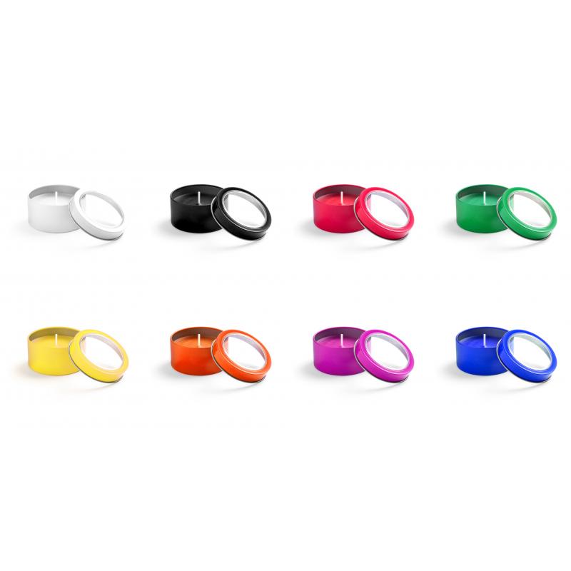 Vela aromática de fragancia vainilla presentada en original tarro metálico con ventana transparente en variada gama de vivos colores.