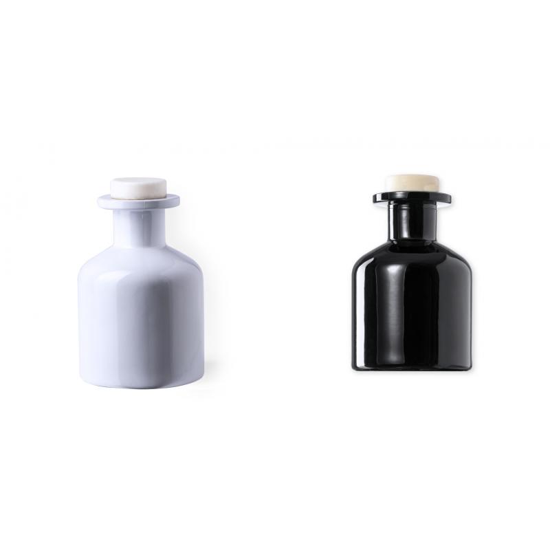 Difusor aromático 100 ml, fabricado en cristal de acabado sólido. Con 8 varillas de ratán y tapón antiderrame. Blanco aroma vainilla y negro aroma sándalo. Presentado en caja individual blanca con ventana.