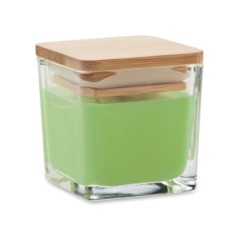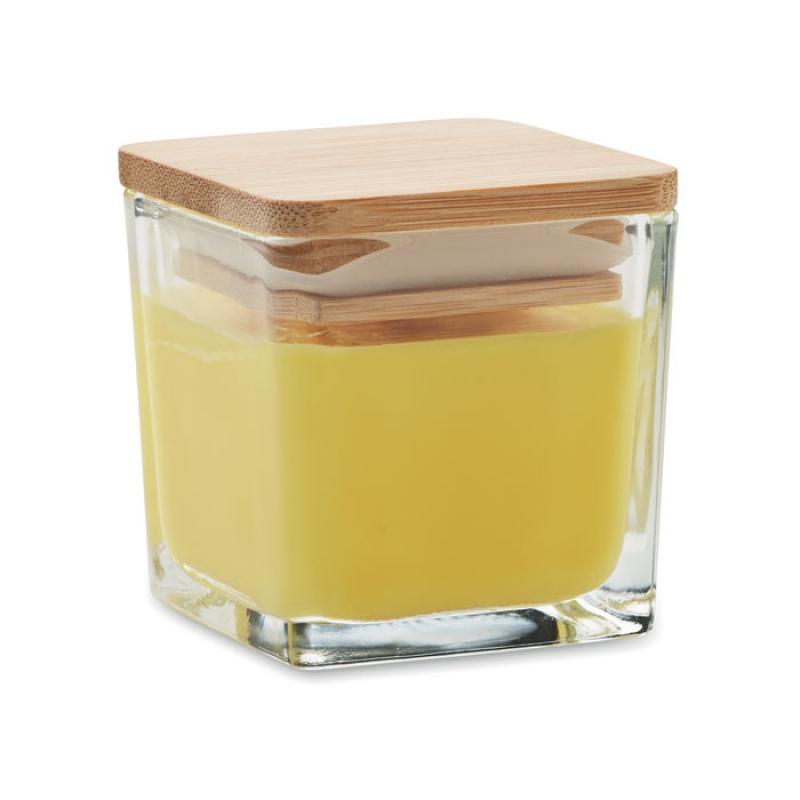 Vela de cera aromatizada a base de plantas en envase de cristal cuadrado con tapa de bambú. 50 gr. Tiempo de combustión: 8 horas. Blanco(06) vainilla, amarillo(08) limón, naranja(10) naranja, verde(48) manzana.Recipiente :