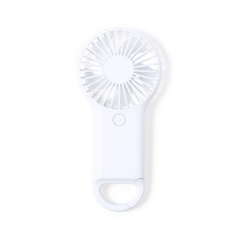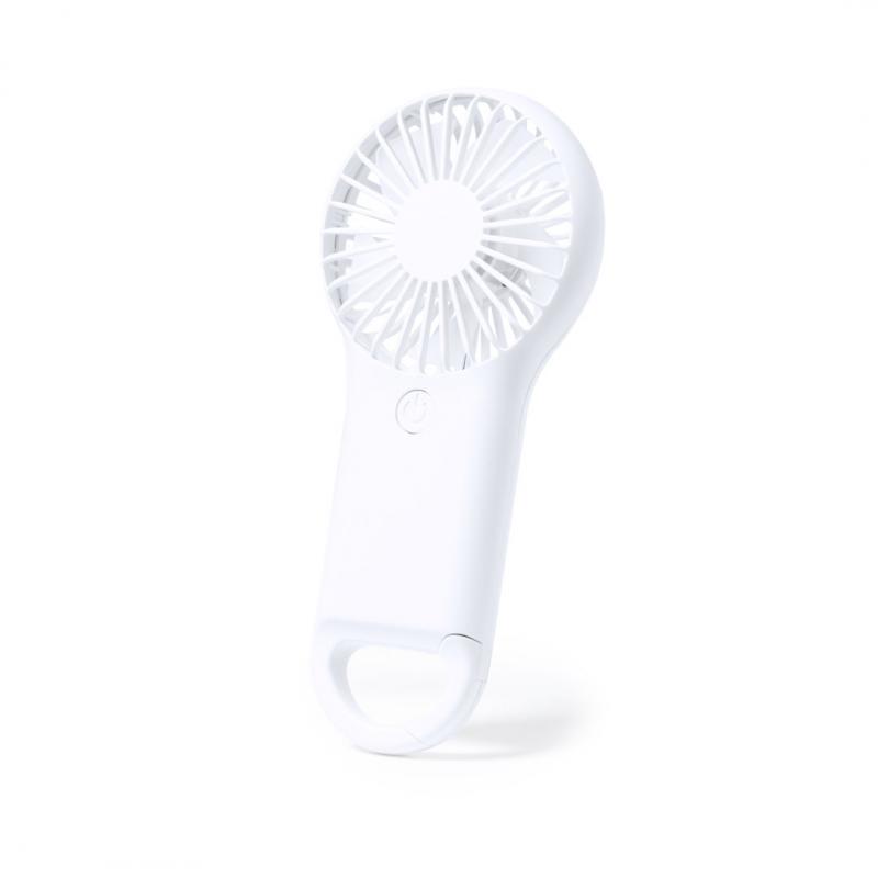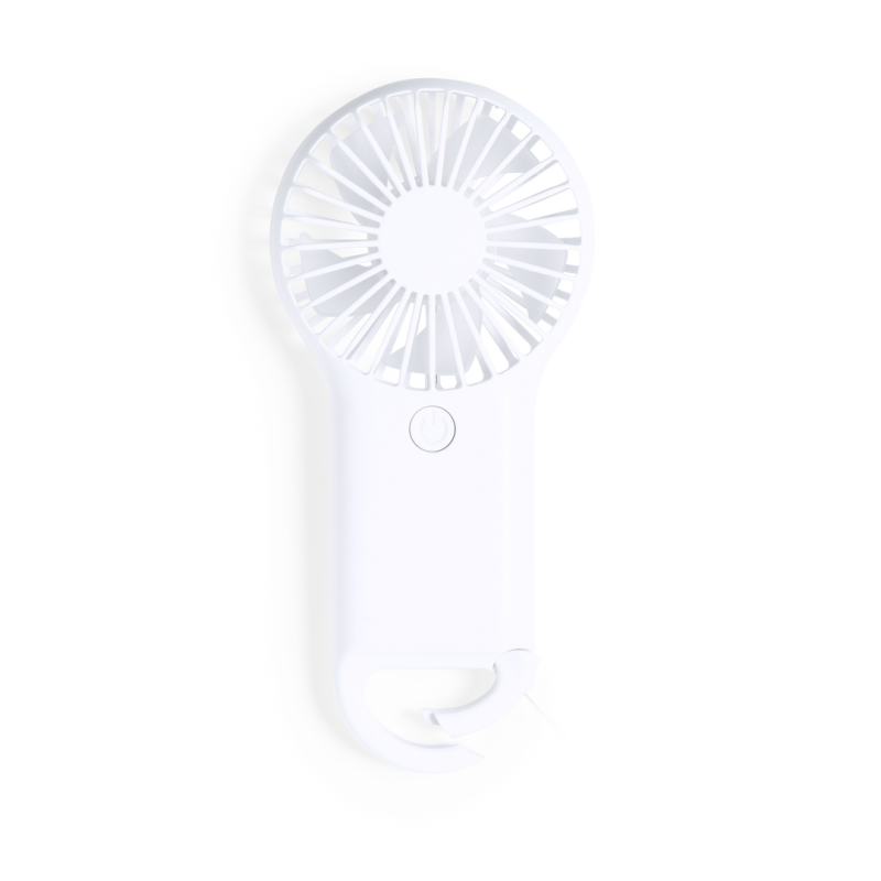 Ventilador fabricado en resistente ABS de color blanco, con mosquetón de enganche integrado. Con 2 velocidades de funcionamiento y presentado en caja individual de diseño kraft. Alimentación a pilas (3xAAA no incluidas).