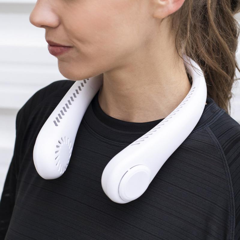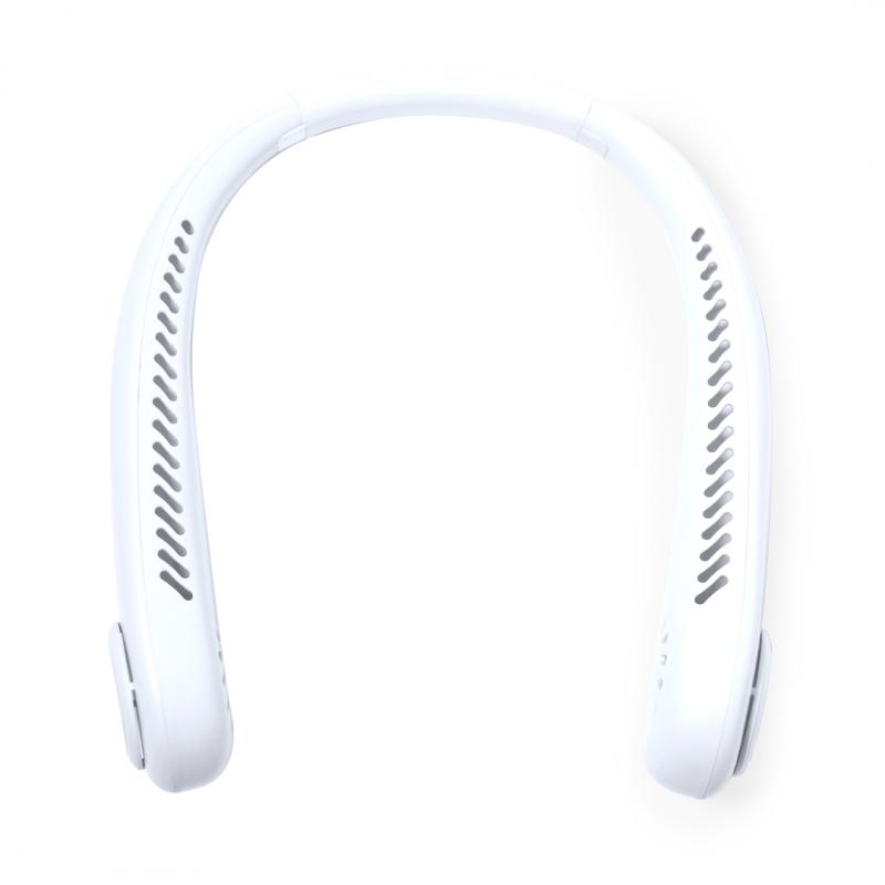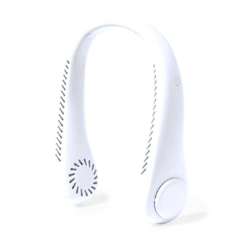 Práctico ventilador portátil fabricado en resistente ABS. Este elegante ventilador tiene un diseño en forma de collar para colocarlo alrededor del cuello, brindando una sensación refrescante. Ofrece tres posiciones de velocidad diferentes y es recargable mediante su batería de 800 mAh, cable Micro USB incluido. Presentado en caja de diseño kraft.