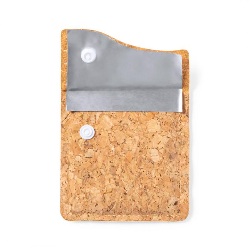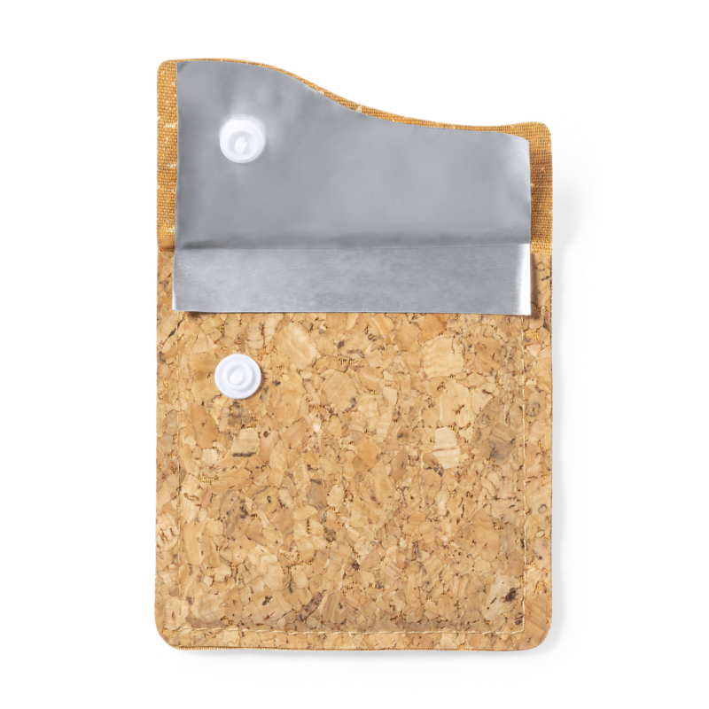 Cenicero de bolsillo de línea nature, con exterior en corcho natural e interior en aluminio ignífugo. Original solapa con cierre de corchete.